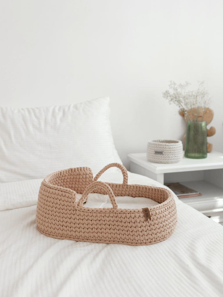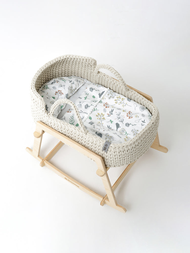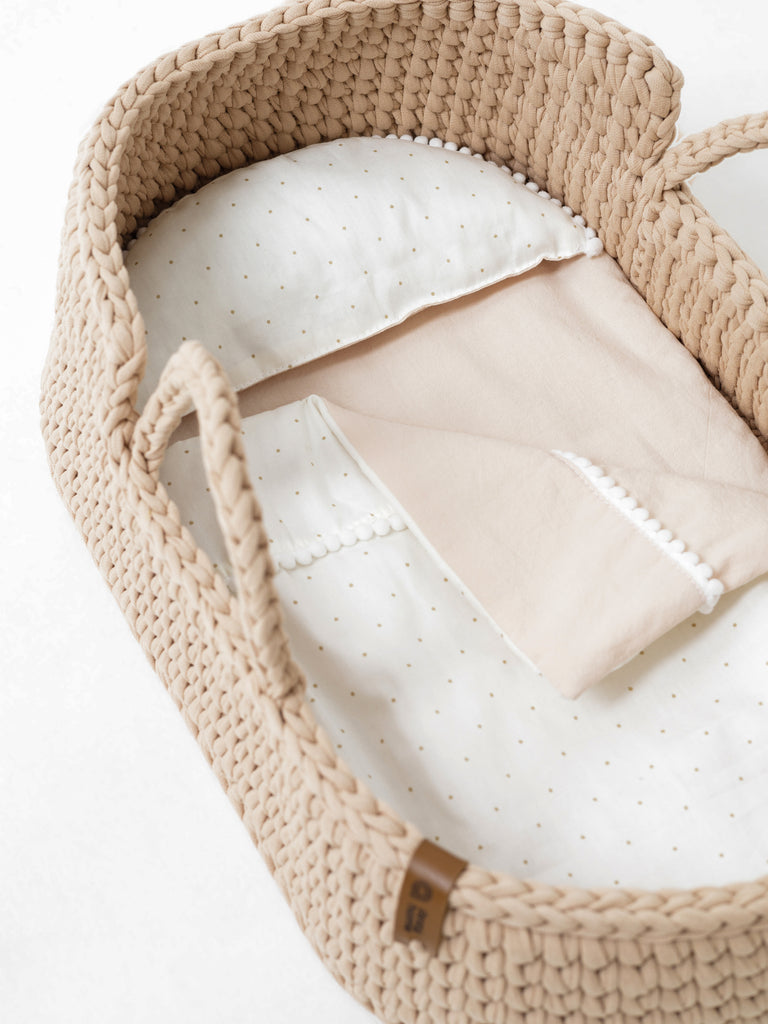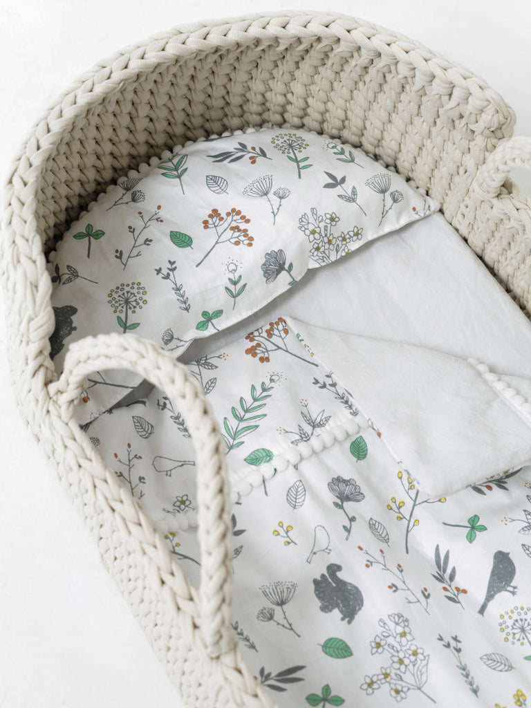 Reversible Bedding: Includes a mattress and reversible cotton bedding with two sides — one patterned and one plain — decorated with charming pompoms. The bedding matches the basket as shown in the photo.