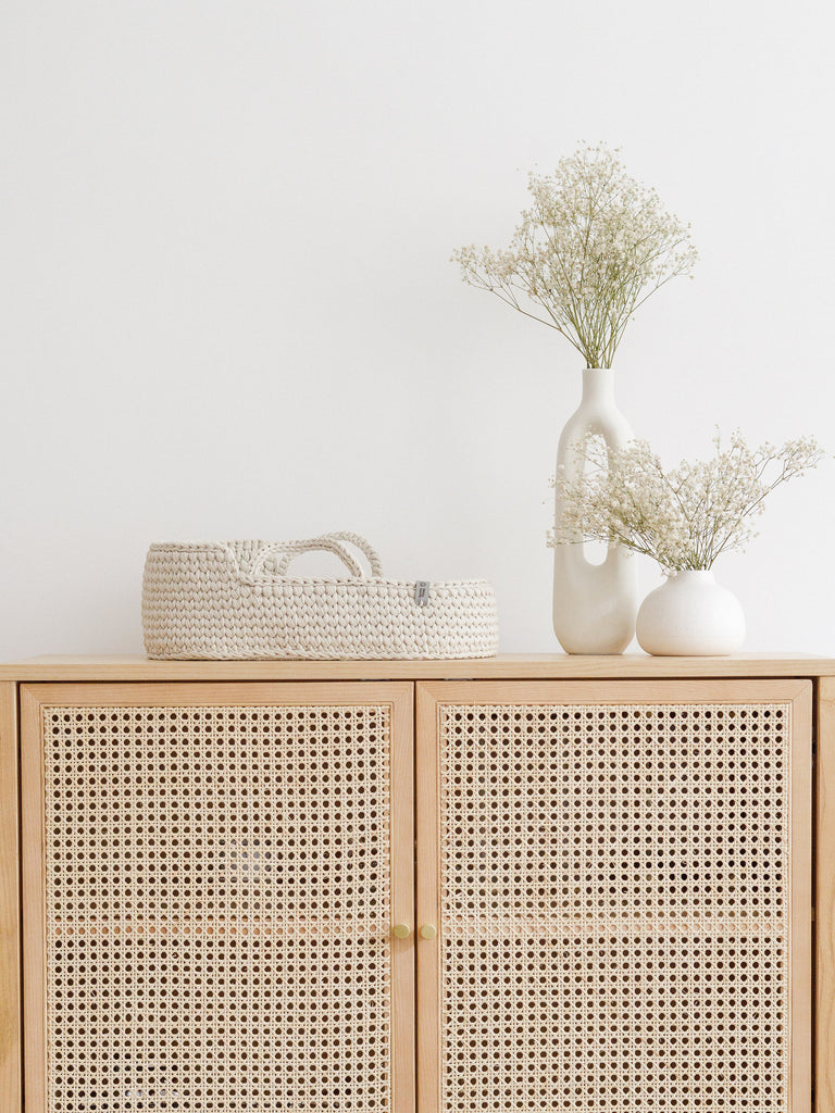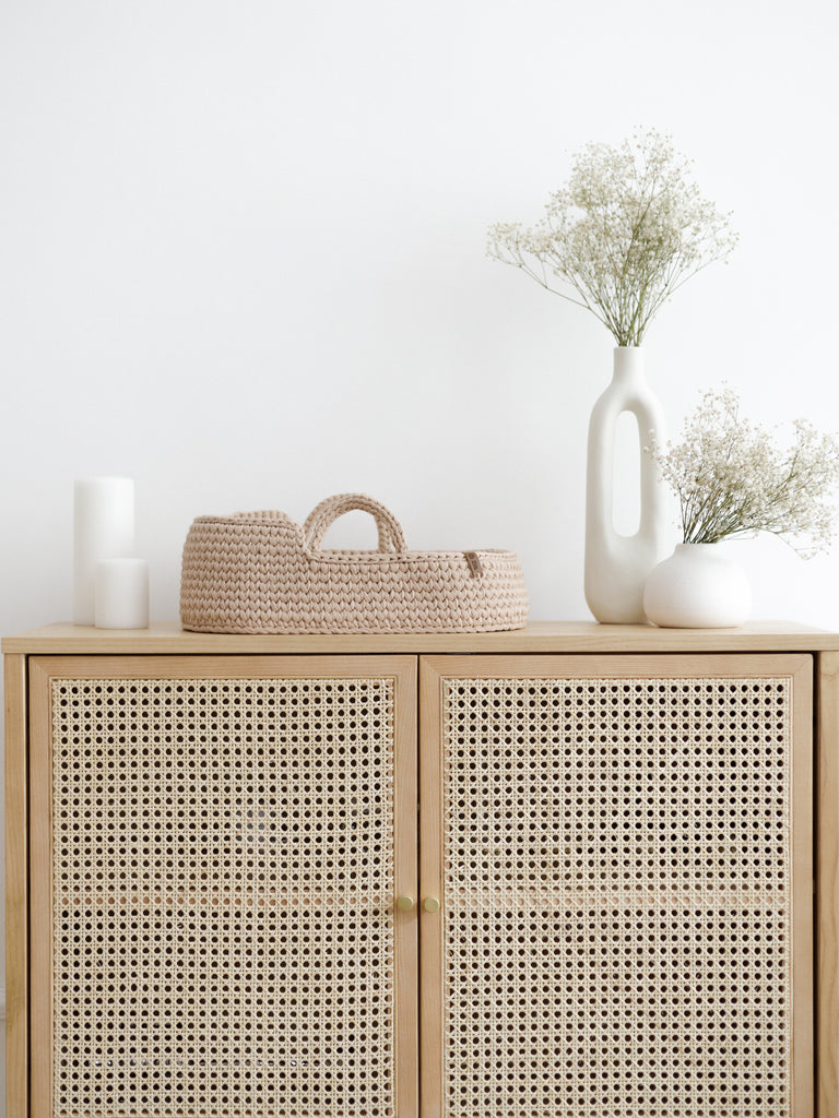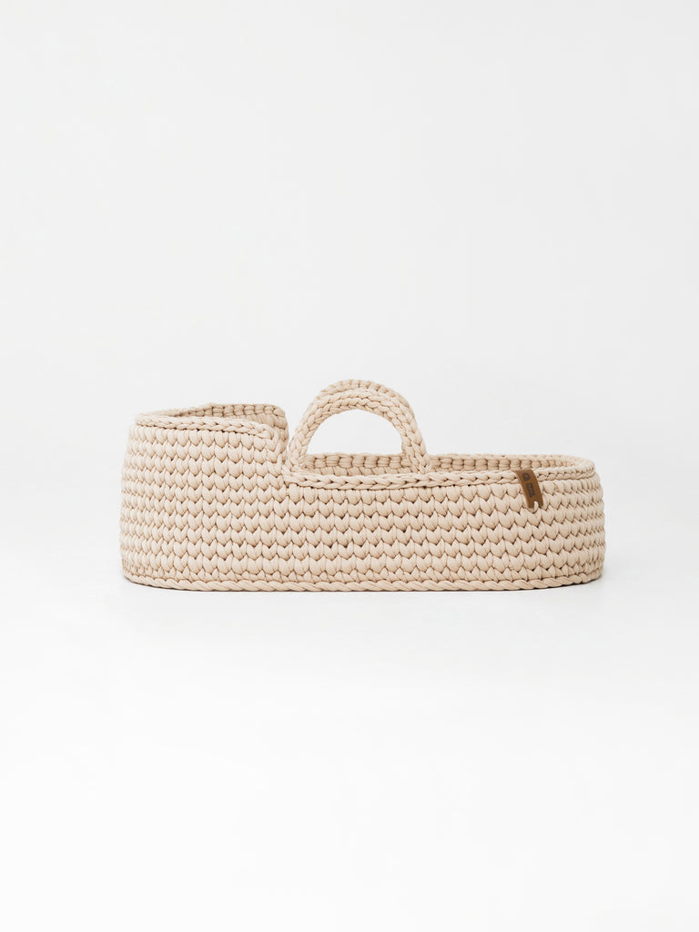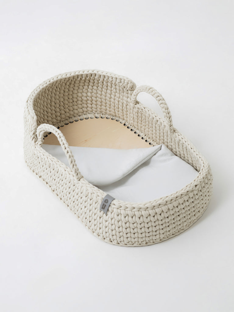 Reversible Bedding: Includes a mattress and reversible cotton bedding with two sides — one patterned and one plain — decorated with charming pompoms. The bedding matches the basket as shown in the photo.