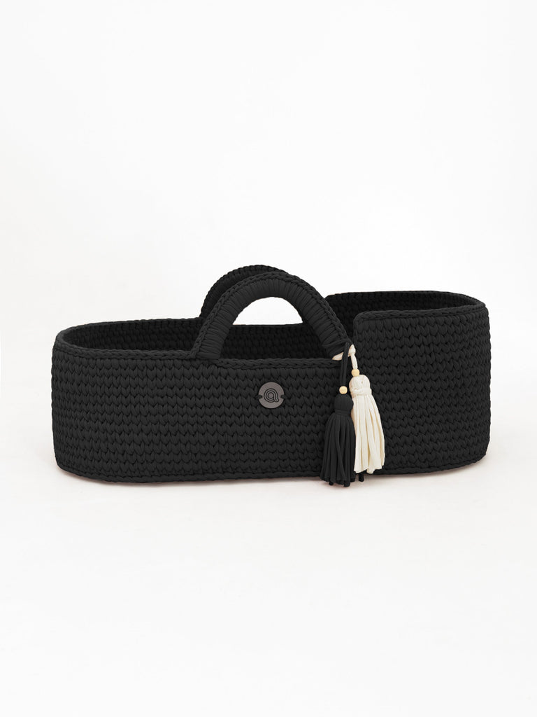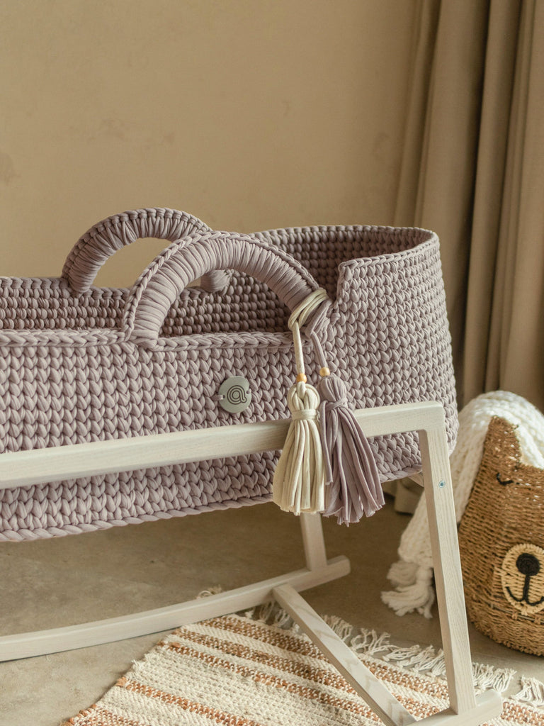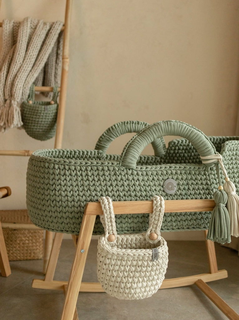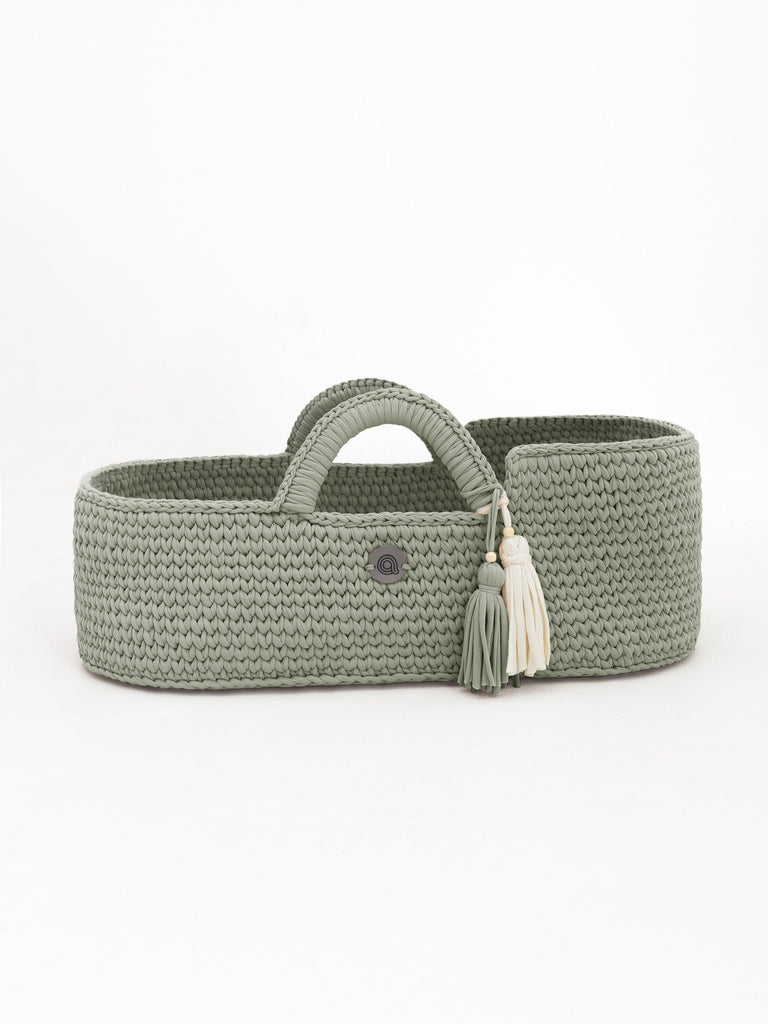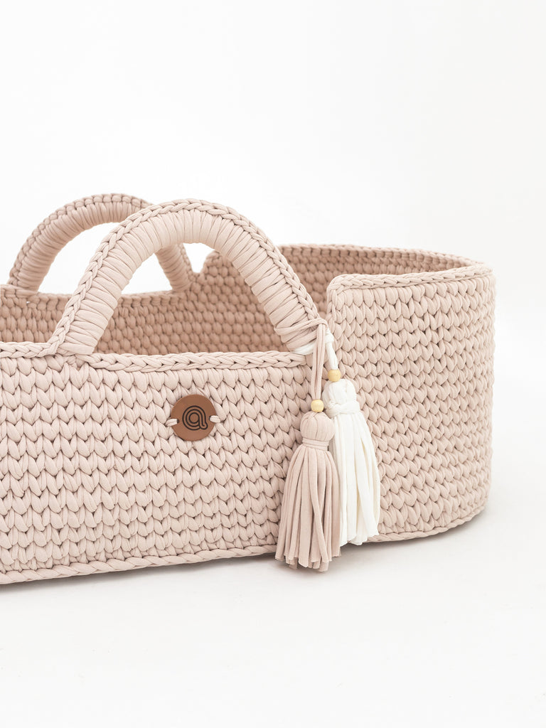 Hand-crocheted baby Moses basket of premium quality, made of OEKO-TEX® certified cotton and plywood. Includes mattress.