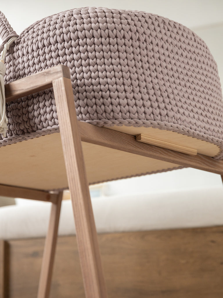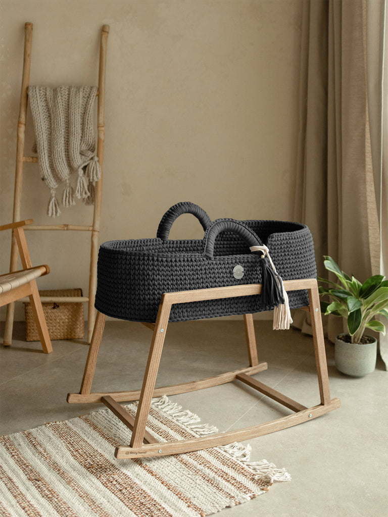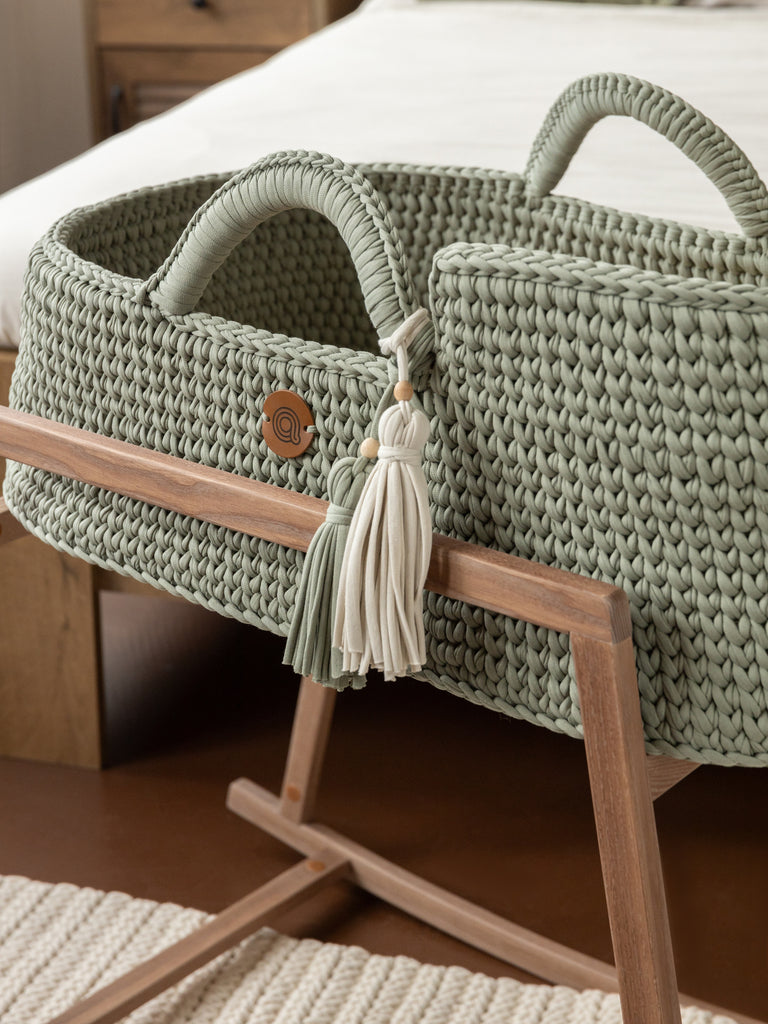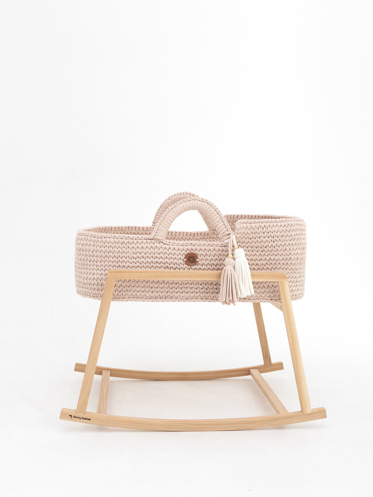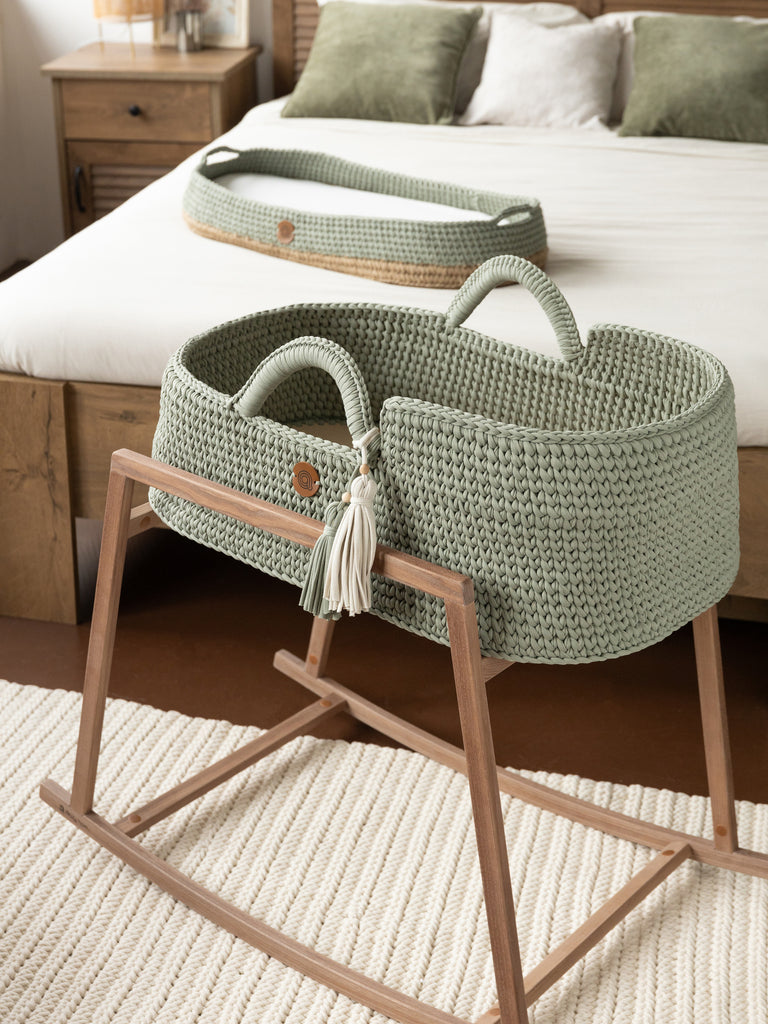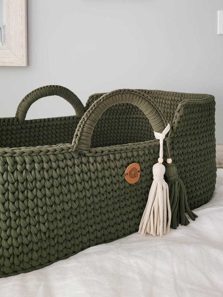 Hand-crocheted baby Moses basket of premium quality, made of OEKO-TEX® certified cotton and plywood. Includes mattress.
