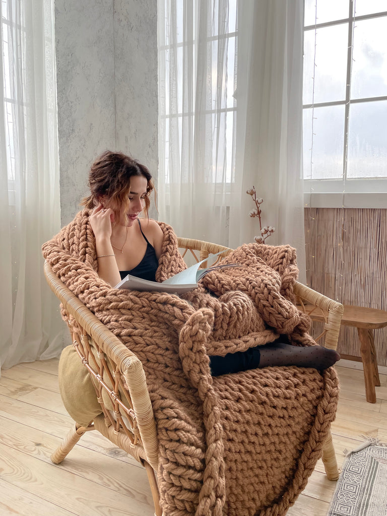 Our blankets are custom made by hands using the arm knitting technique. Our chic plaids are full of positive feelings and careful care about your comfort. A soft yarn applied is light and delicate, like a cloud.