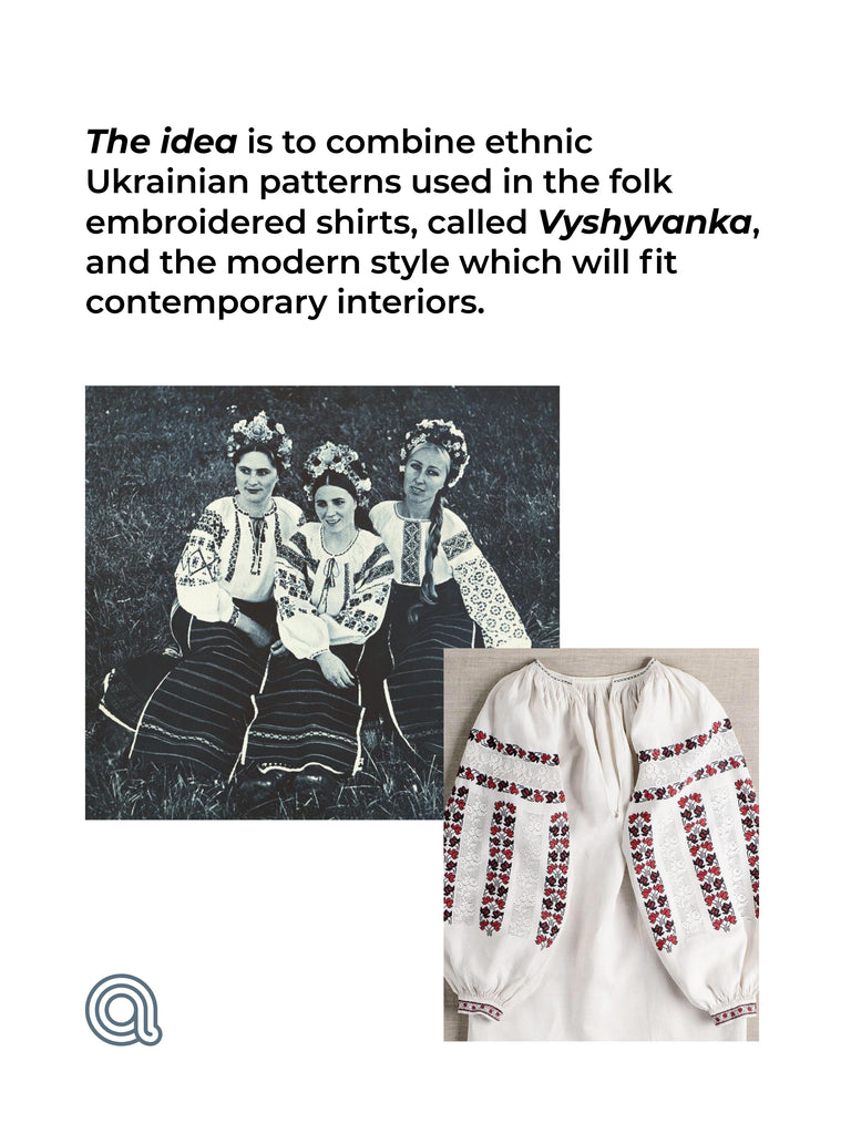 The idea of this art creation is to combine ethnic Ukrainian patterns, which have been originally used in the folk embroidered shirts, called Vyshyvanka, and the modern style which will fit contemporary interiors.