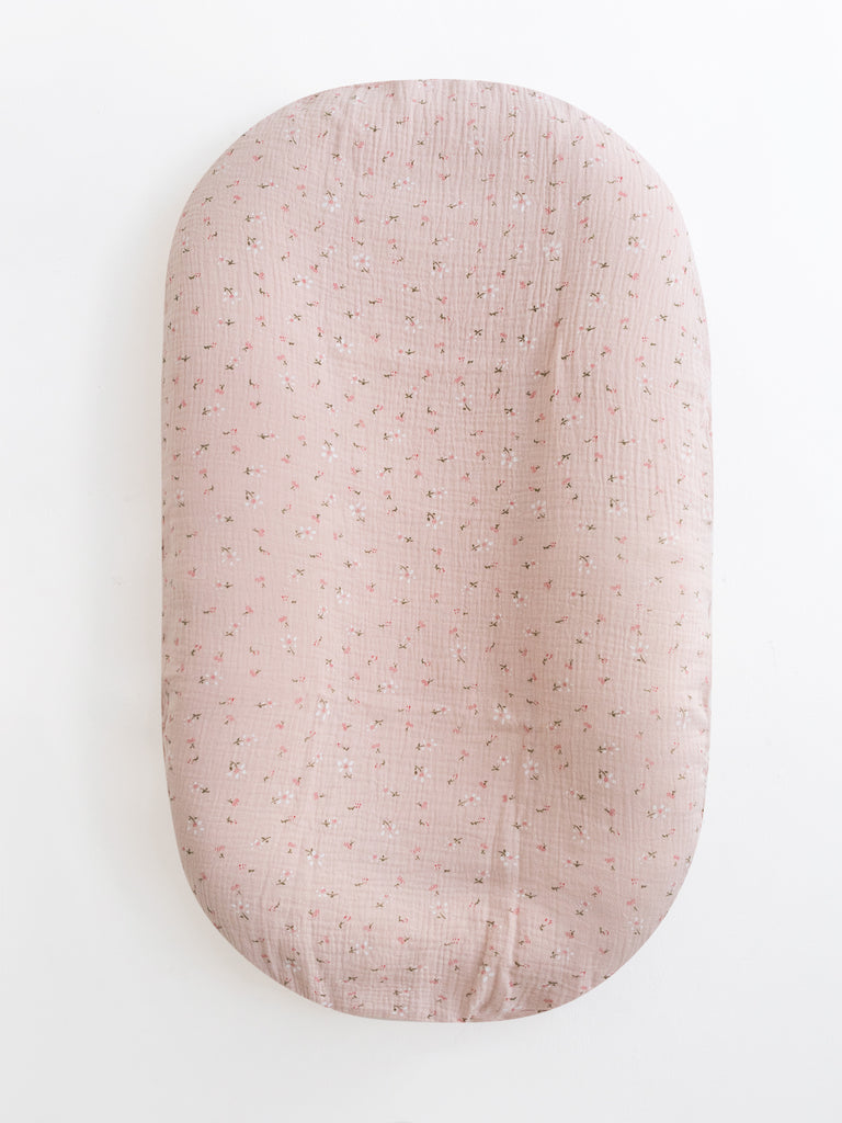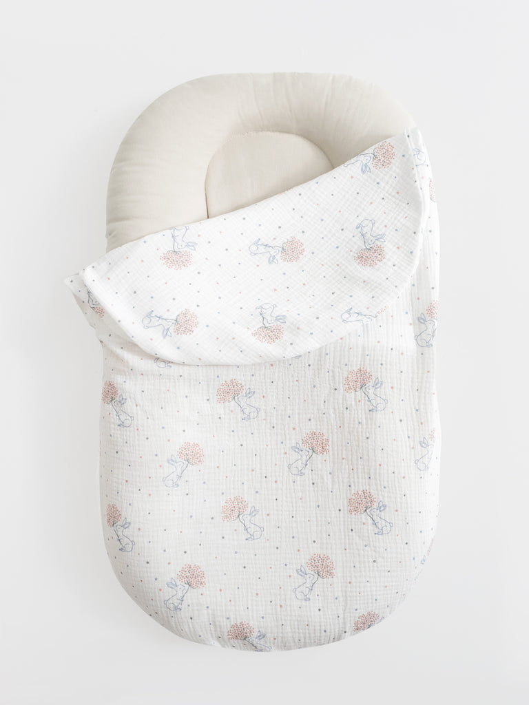 Trendy muslin cover for lounger nest for newborn baby.