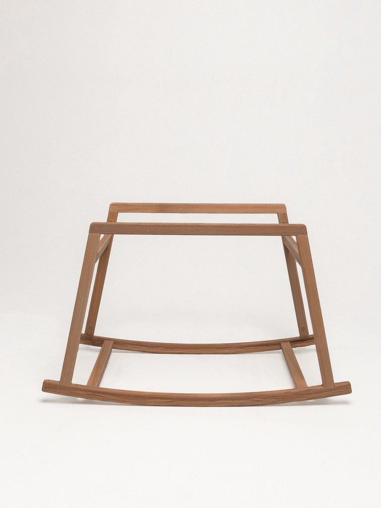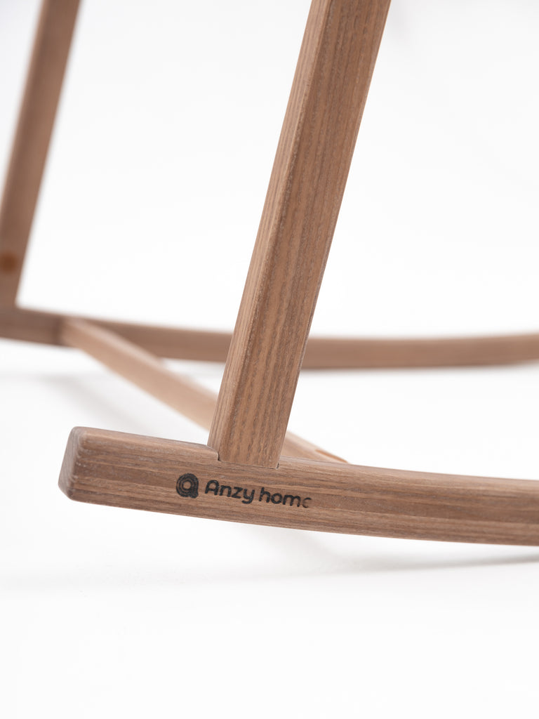 The rocking stand features a sturdy structure made of natural ash hardwood and is coated with an eco-friendly and baby-safe certified oil coating. We do not use solid paint, therefore all stand colors — natural, white, nut, and black — display natural wood textures.