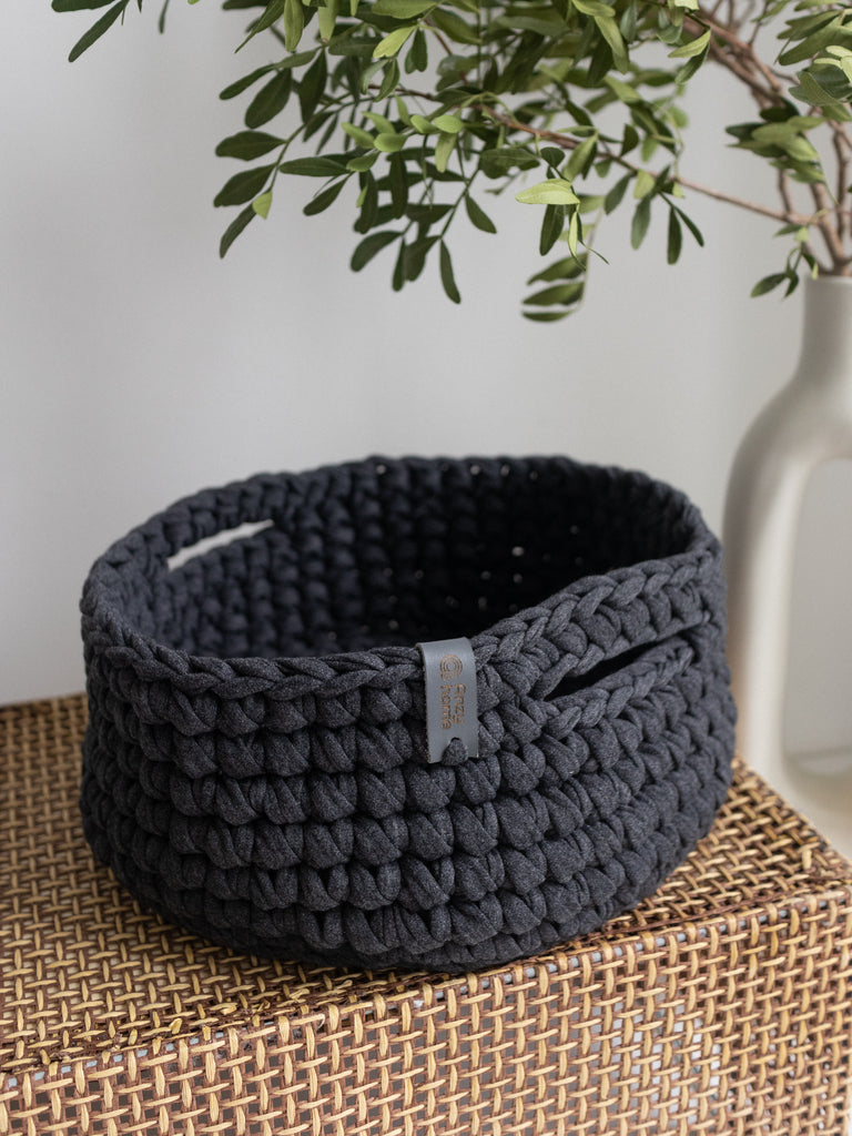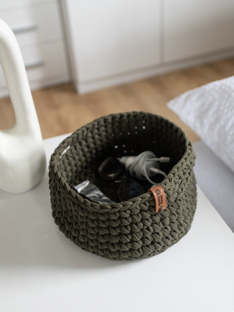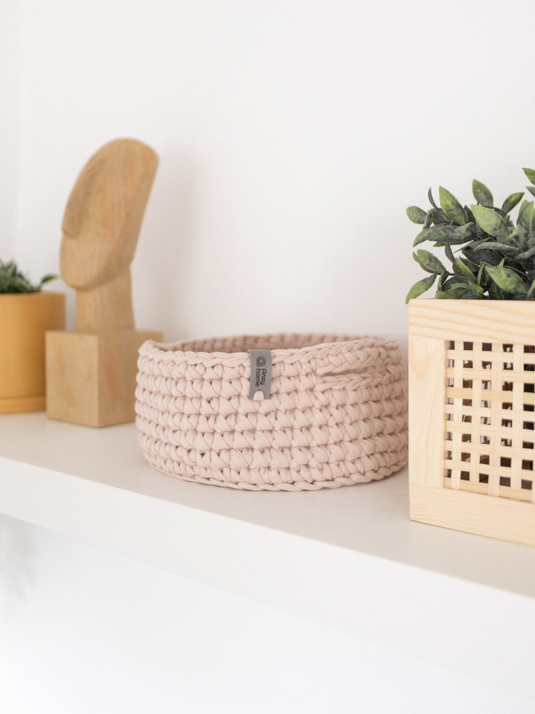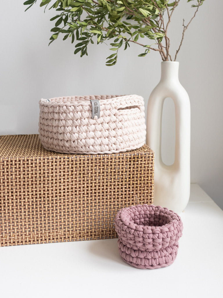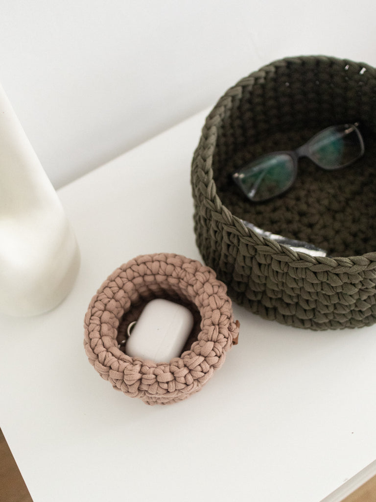Small soft round storage baskets are hand-crocheted in Ukraine with care for quality and durability. They are perfect for organizing and adding a decorative touch to any space. Good option as a small gift.