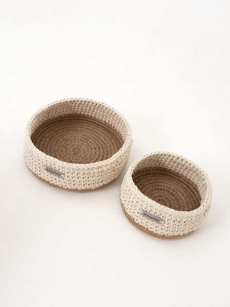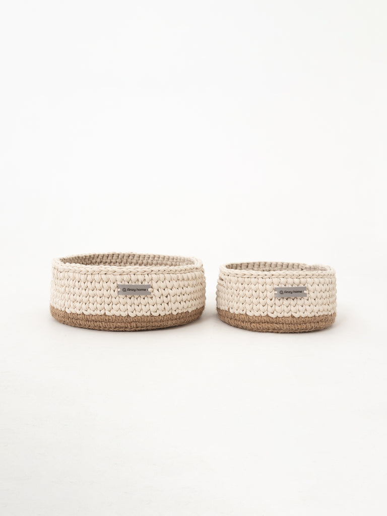 These beautiful round baskets featuring a unique jute accent add a charming touch to your home. They are perfect for storing small items all over the house and are easy to care for.