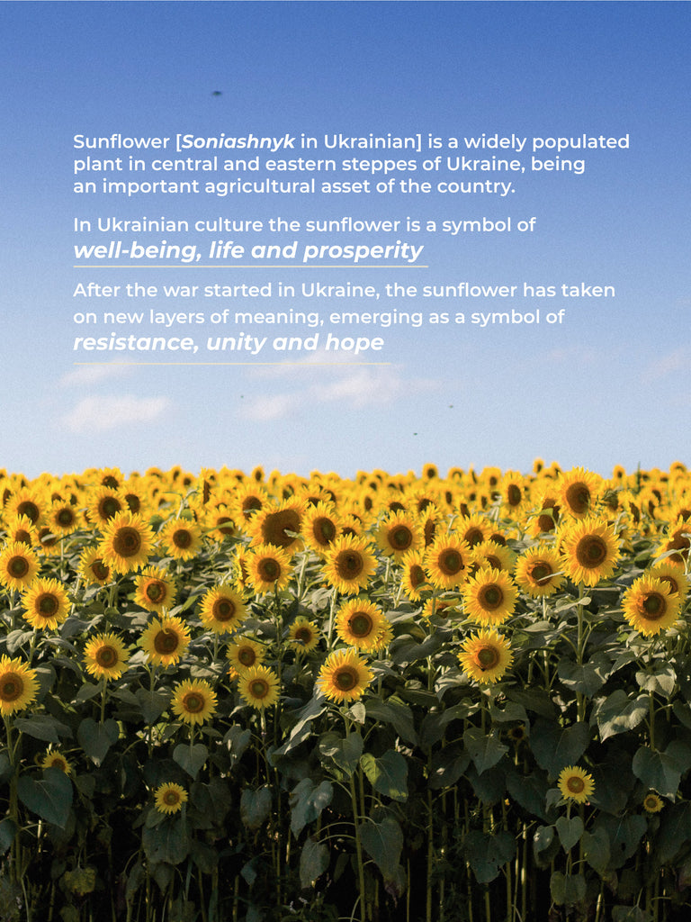The flower (called "Soniashnyk" in Ukrainian) is a widely populated plant in central and eastern steppes of Ukraine, being an important agricultural asset of the country. In Ukrainian culture the sunflower is a symbol of well-being, life and prosperity. After the war started in Ukraine, the sunflower has taken on new layers of meaning, emerging as a symbol of resistance, unity and hope.