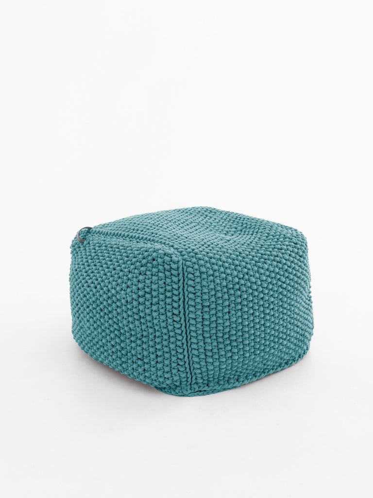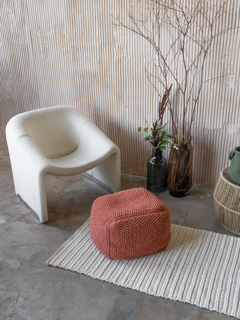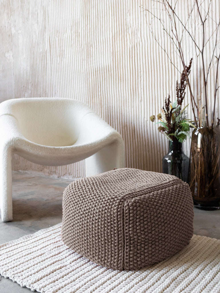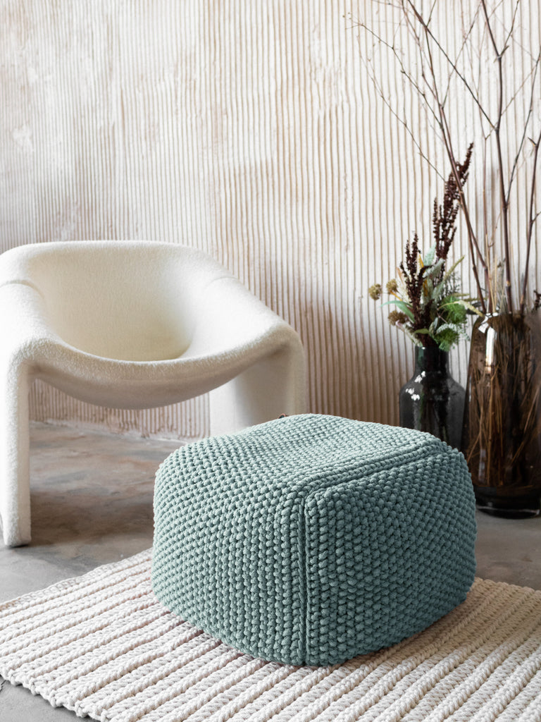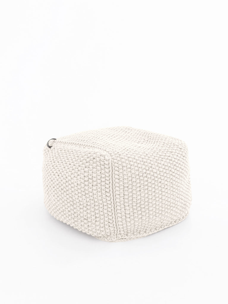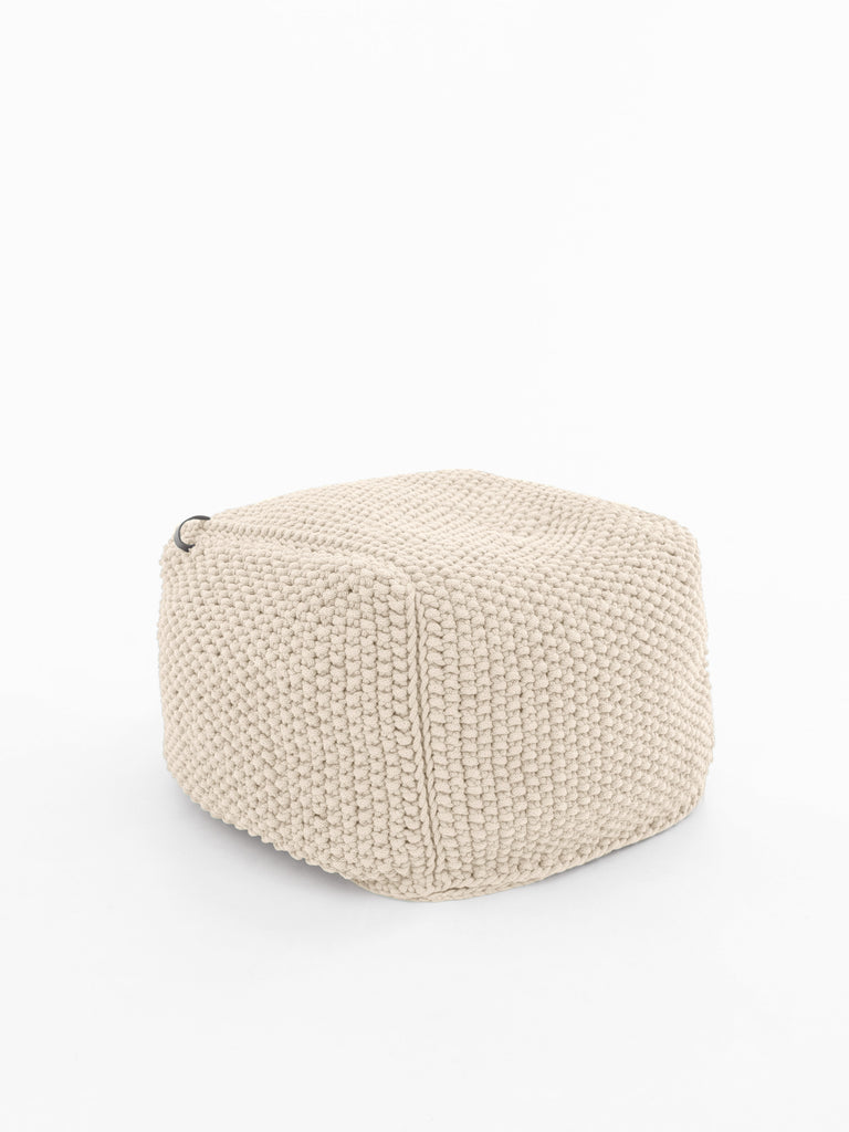 Pouf Square, hand-knitted from 100% recycled cotton, is designed to function as a versatile piece of furniture, perfect as a footstool, extra seating, or a handy coffee table. This cube pouf delivers exceptional comfort and a unique look with its chunky texture, enhancing any space while being conveniently lightweight.