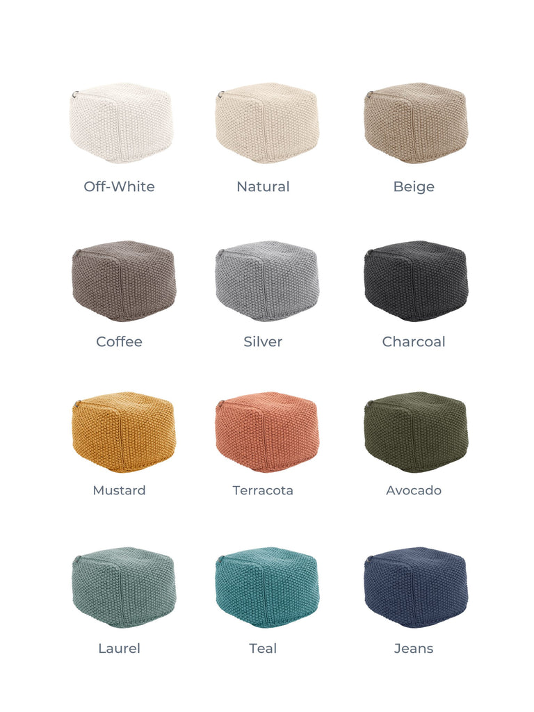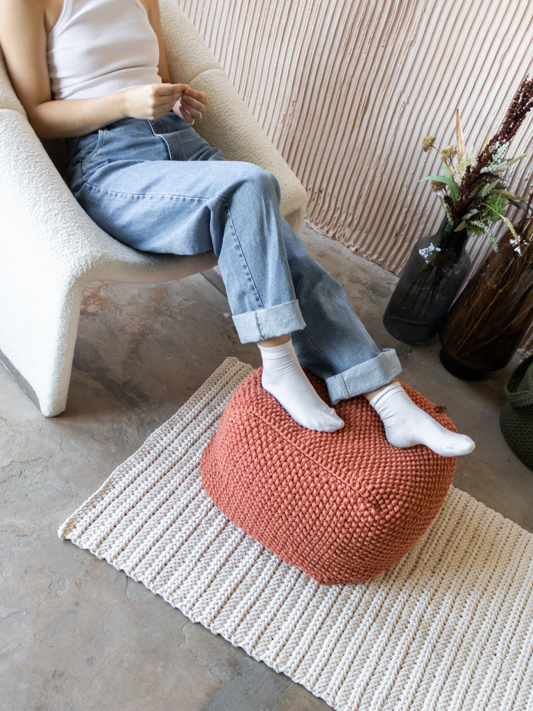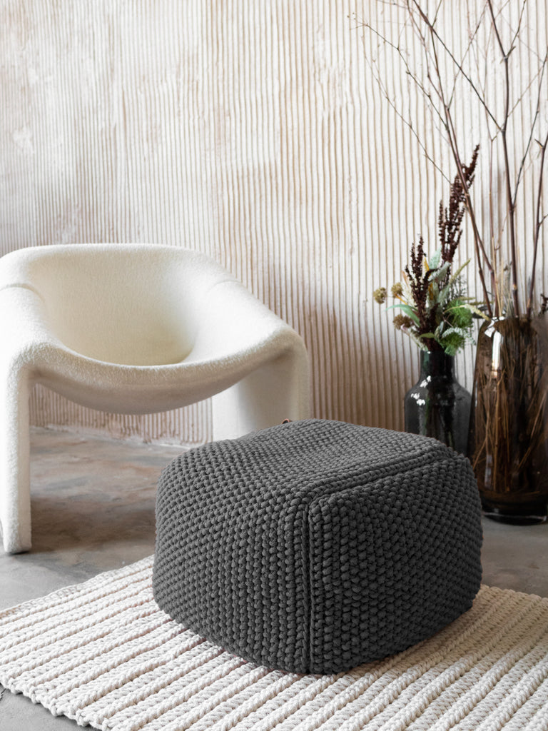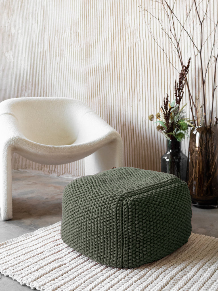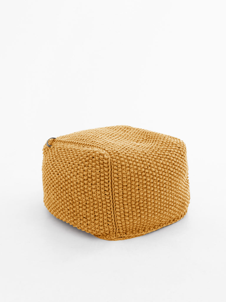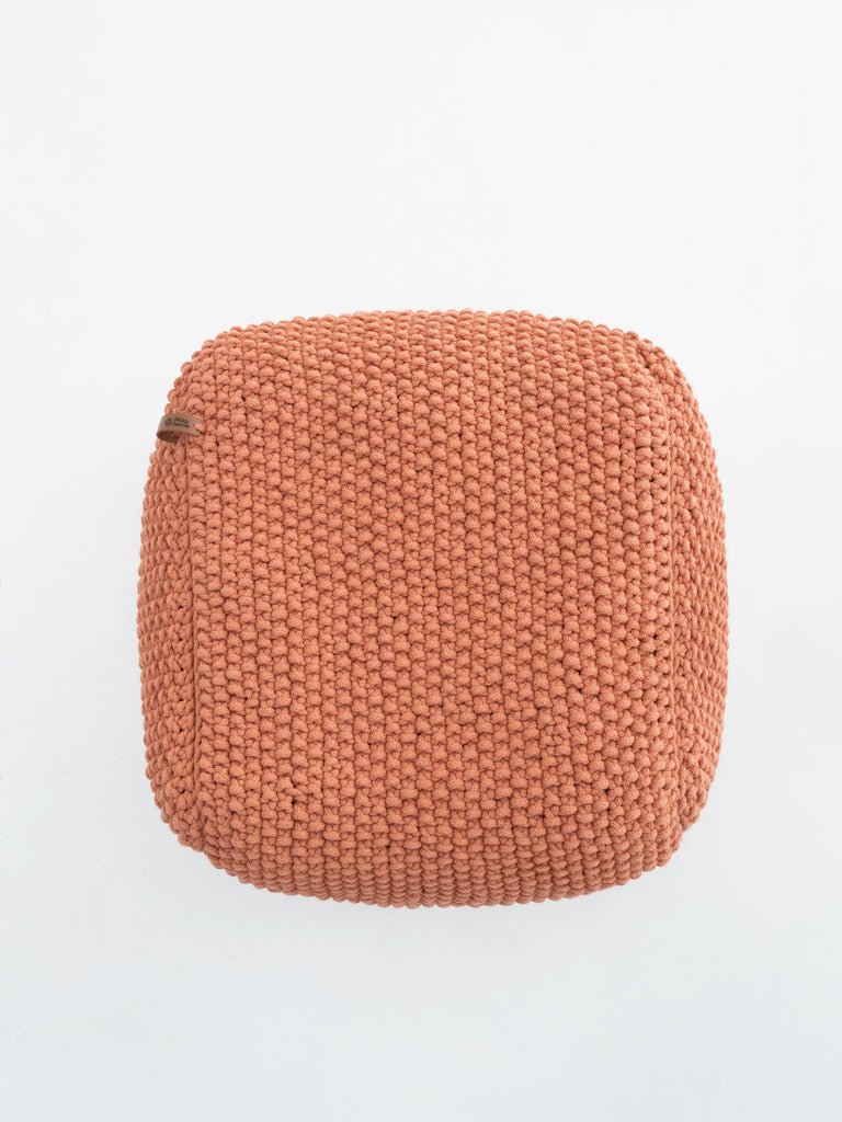 Pouf Square, hand-knitted from 100% recycled cotton, is designed to function as a versatile piece of furniture, perfect as a footstool, extra seating, or a handy coffee table. This cube pouf delivers exceptional comfort and a unique look with its chunky texture, enhancing any space while being conveniently lightweight.