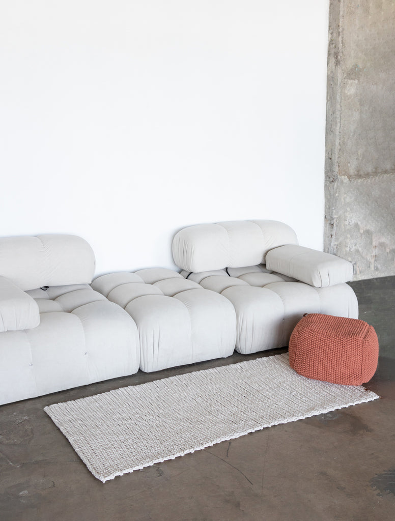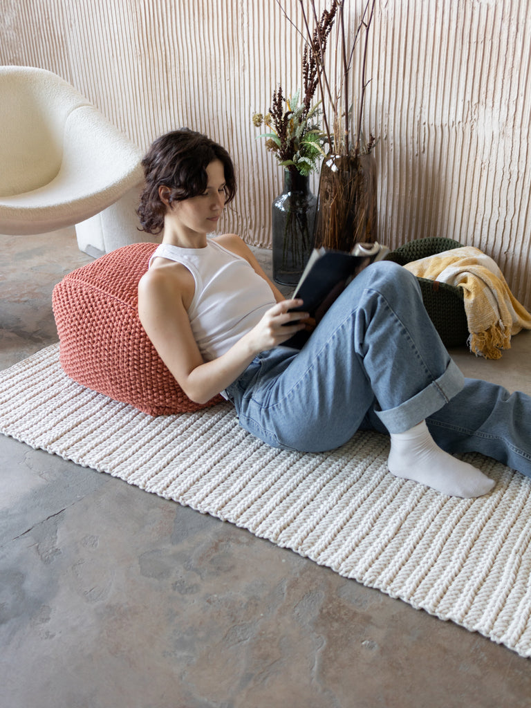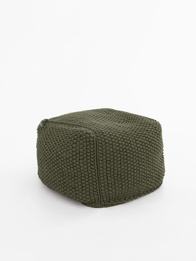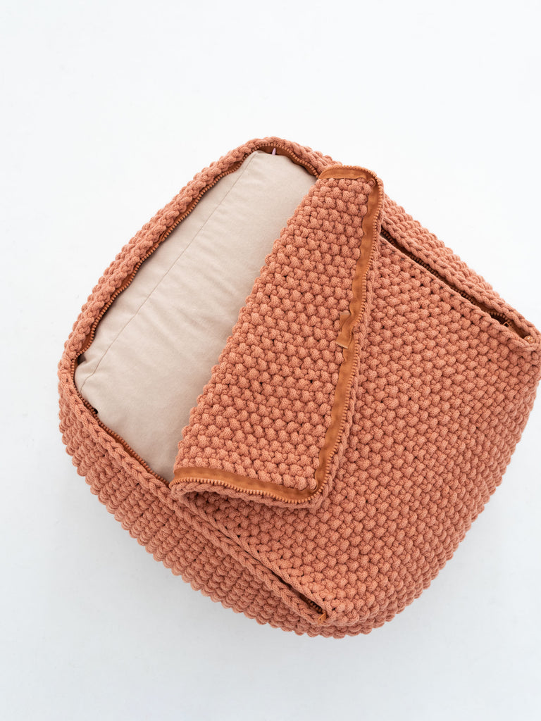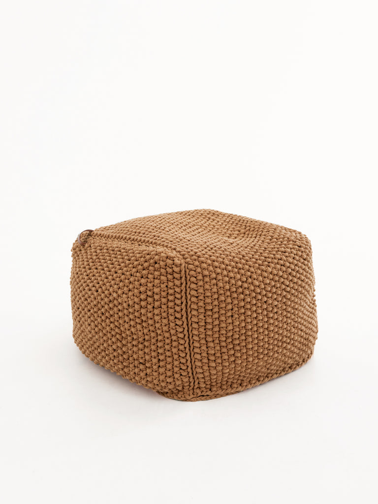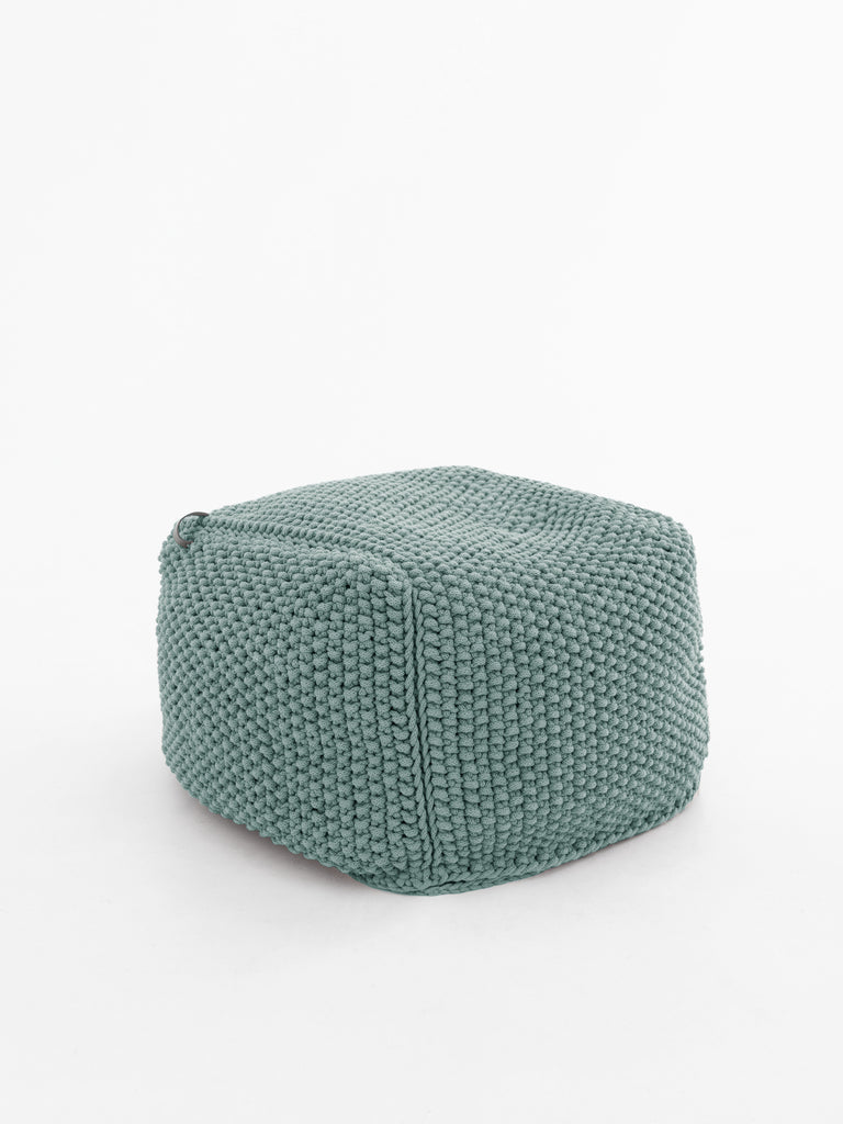 Pouf Square, hand-knitted from 100% recycled cotton, is designed to function as a versatile piece of furniture, perfect as a footstool, extra seating, or a handy coffee table. This cube pouf delivers exceptional comfort and a unique look with its chunky texture, enhancing any space while being conveniently lightweight.