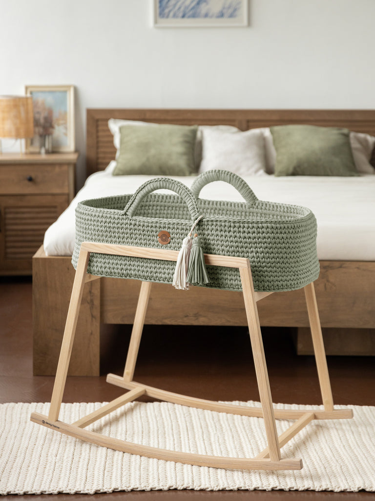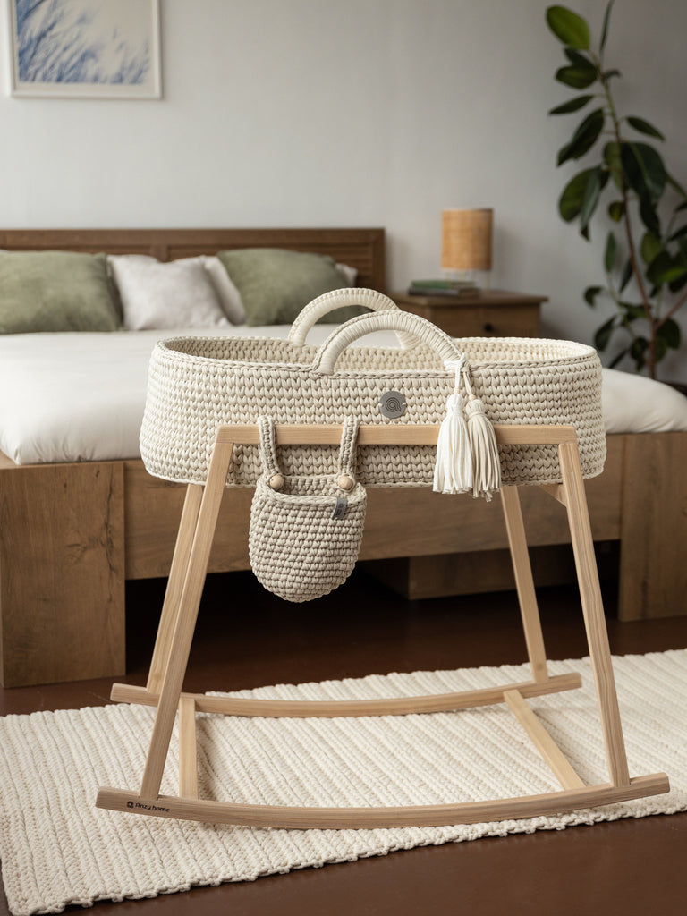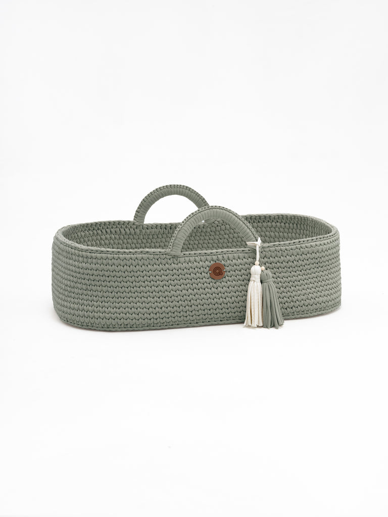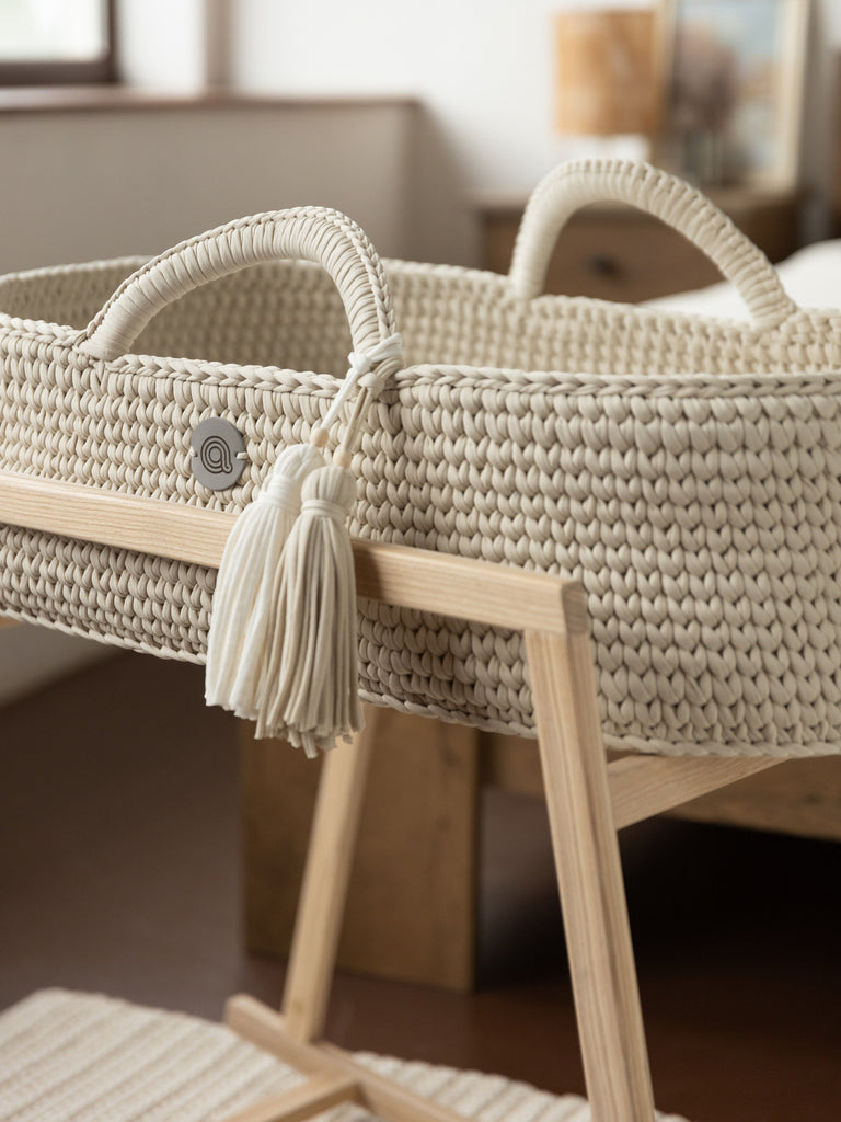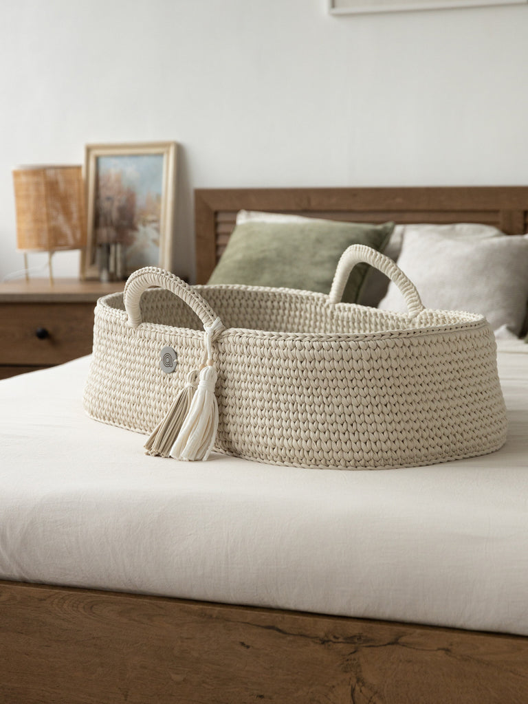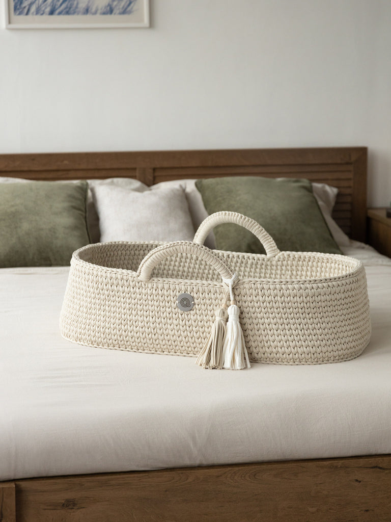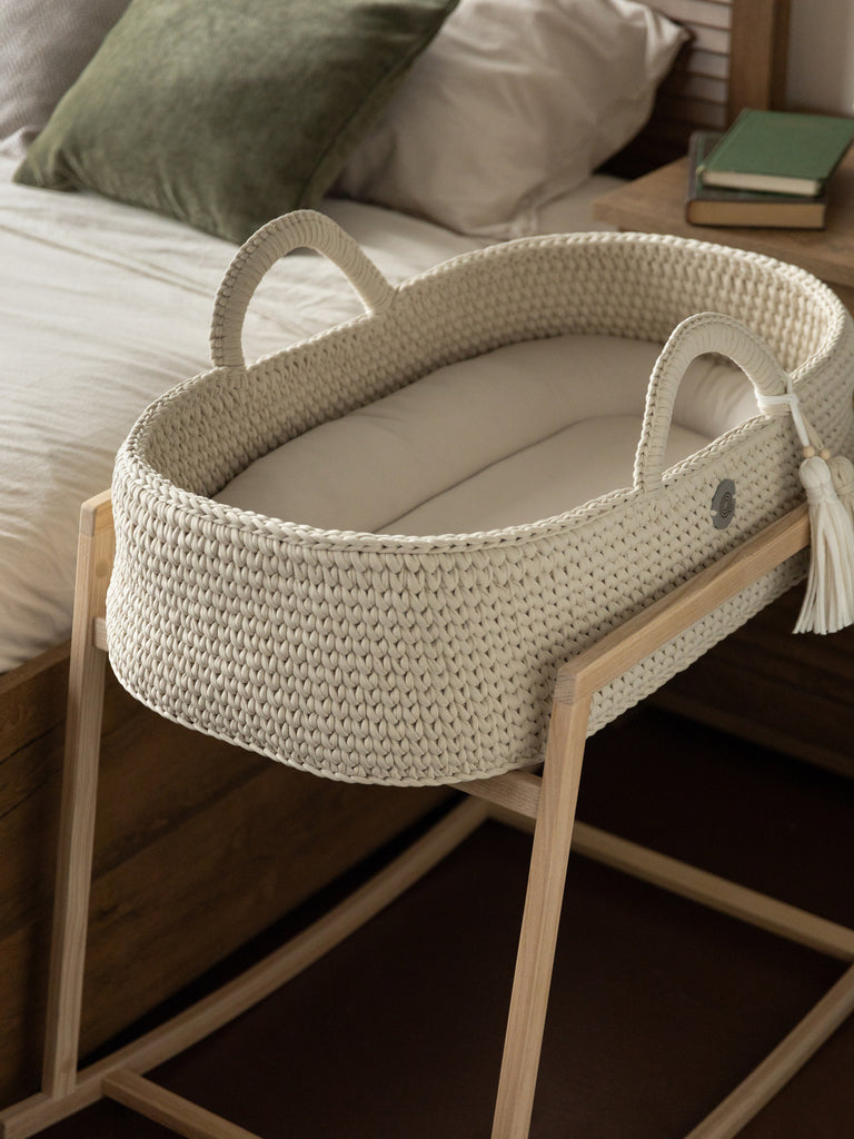 Hand-crocheted baby Moses basket of premium quality, made of OEKO-TEX® certified cotton and plywood. Includes mattress.