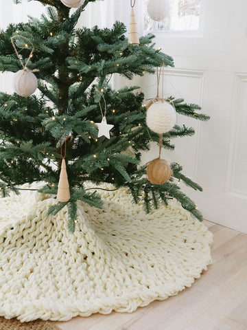 The Christmas tree skirt is arm-knitted of super chunky semi-wool yarn. It is durable but soft and delicate like a cloud.