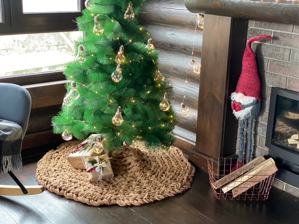 The Christmas tree skirt is arm-knitted of super chunky semi-wool yarn. It is durable but soft and delicate like a cloud.