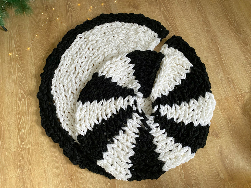 The modern Xmas tree skirt is purely handmade. We use super chunky semi-wool yarn. It is durable but soft and delicate like a cloud.