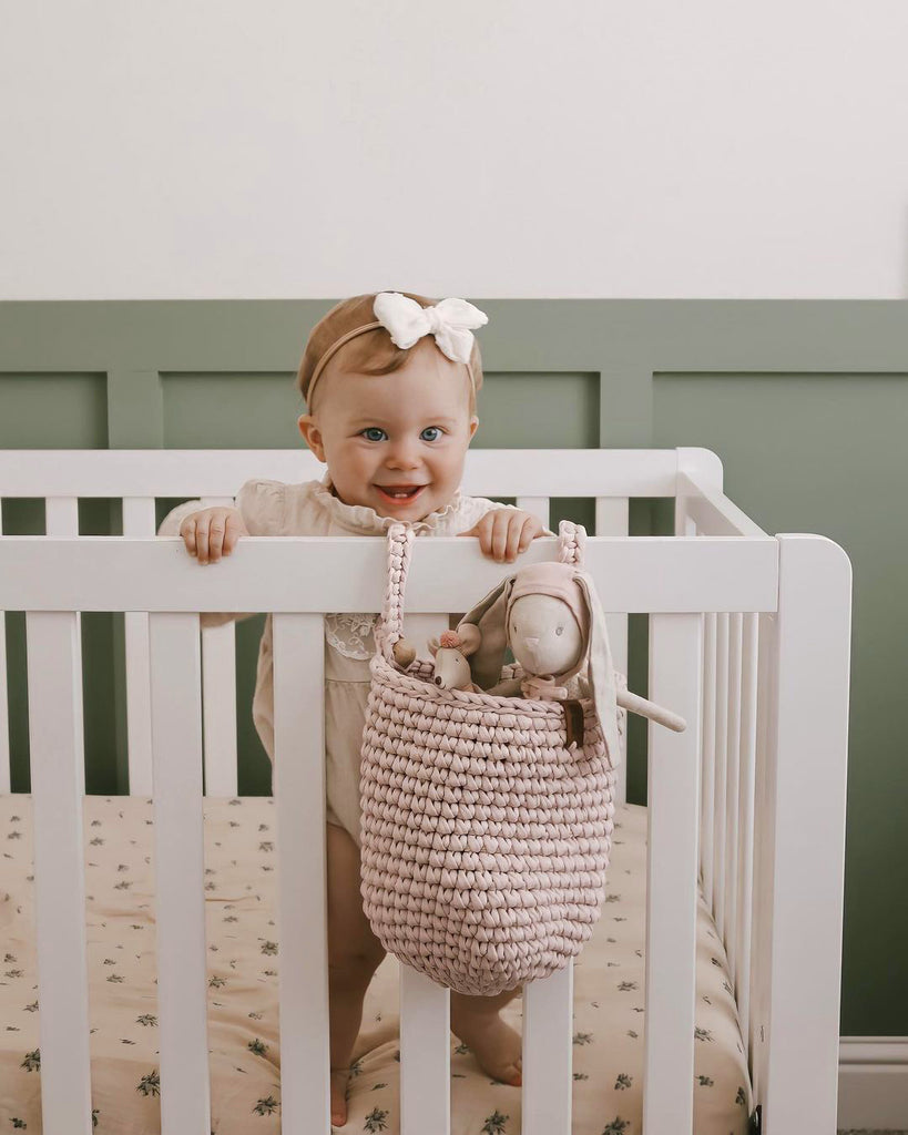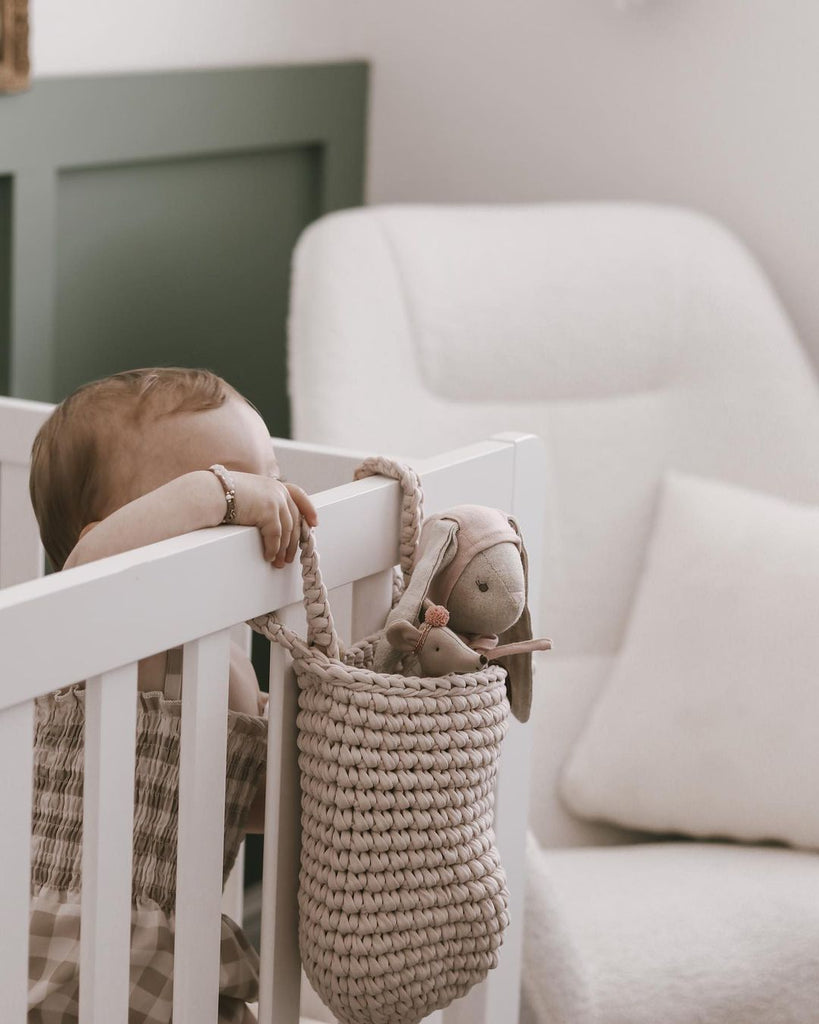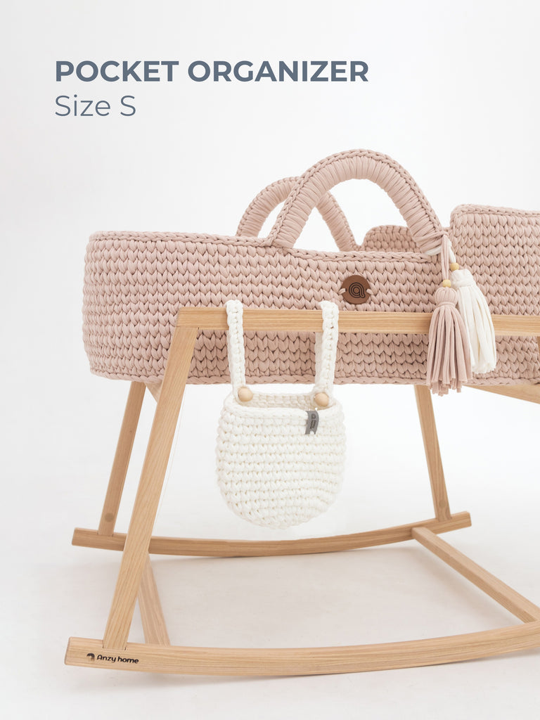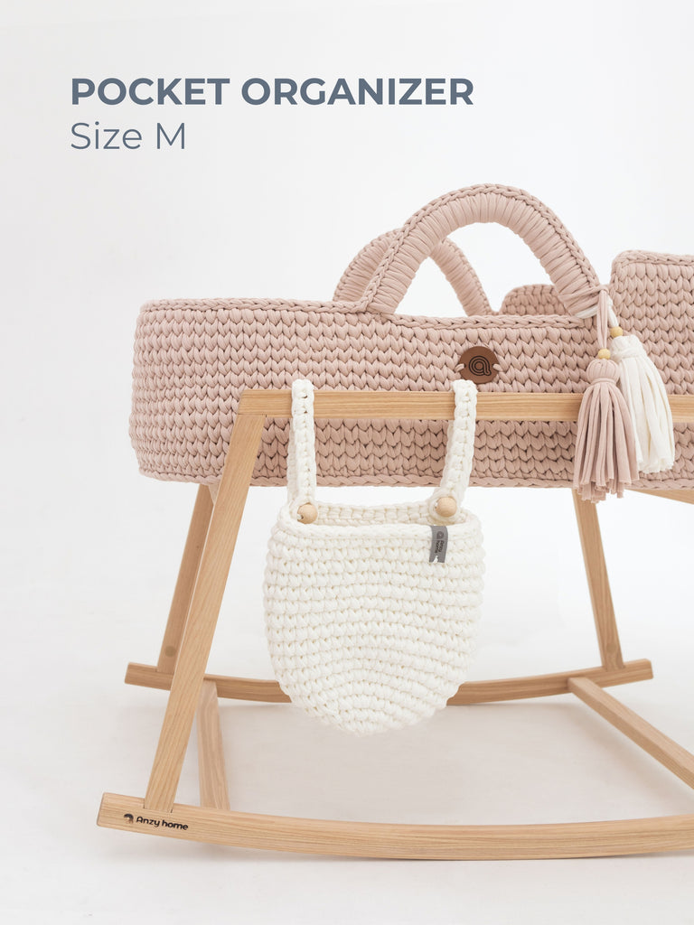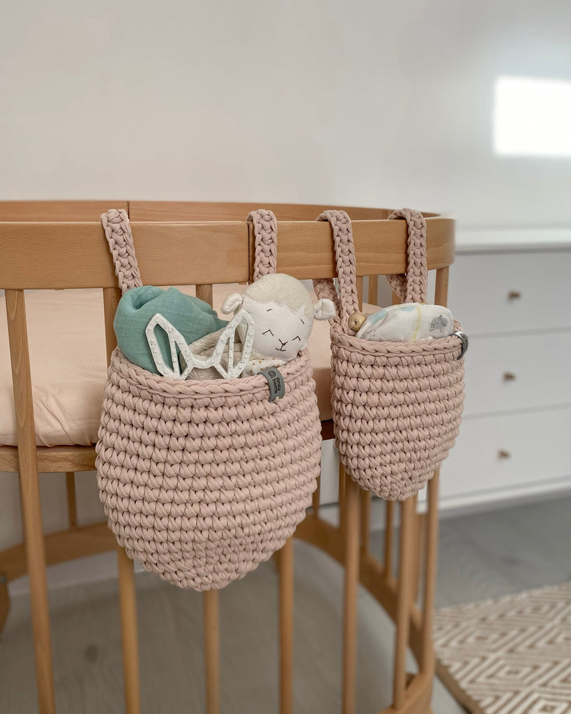 A crib hanging storage baskets are perfect idea for storing small toys, rattles, diapers and other things, that any mom needs to keep on hand. These baskets of natural cotton yarn are good-looking, easy to wash, and to use, stylish accessory for your home.