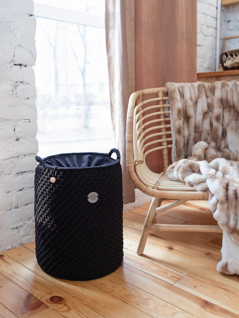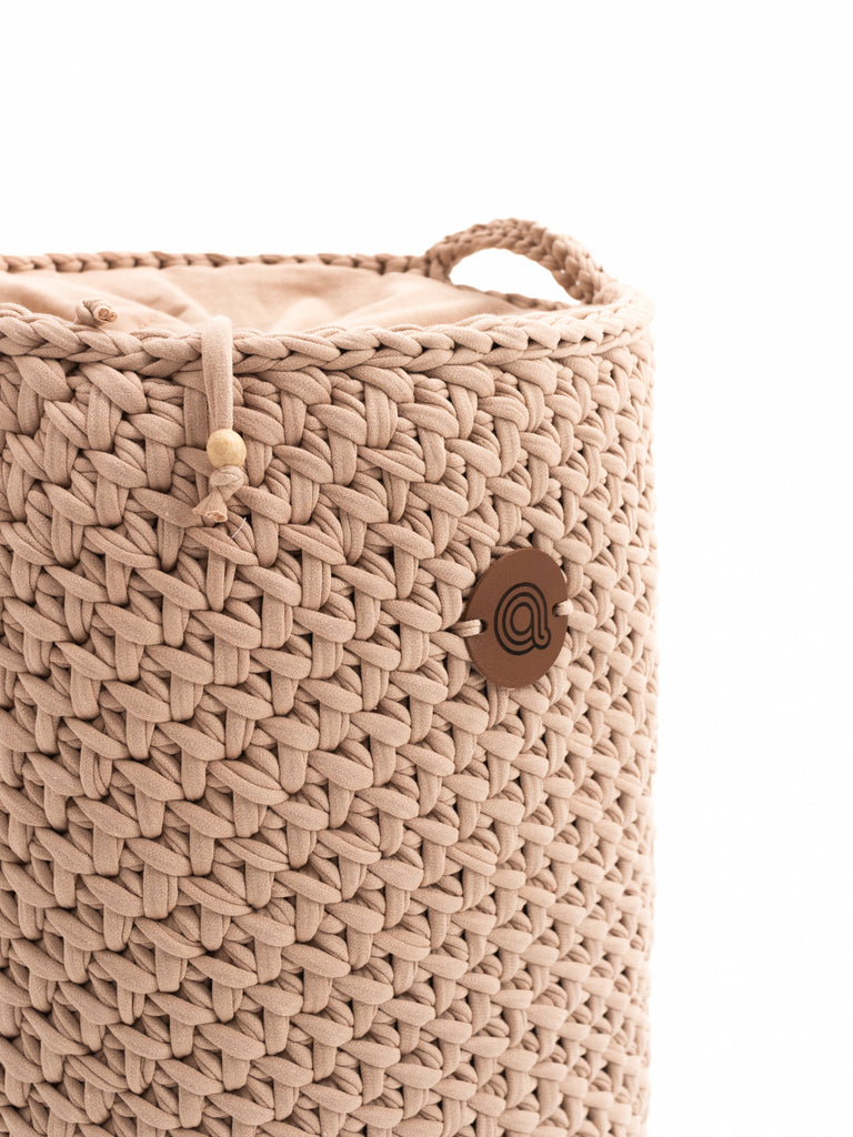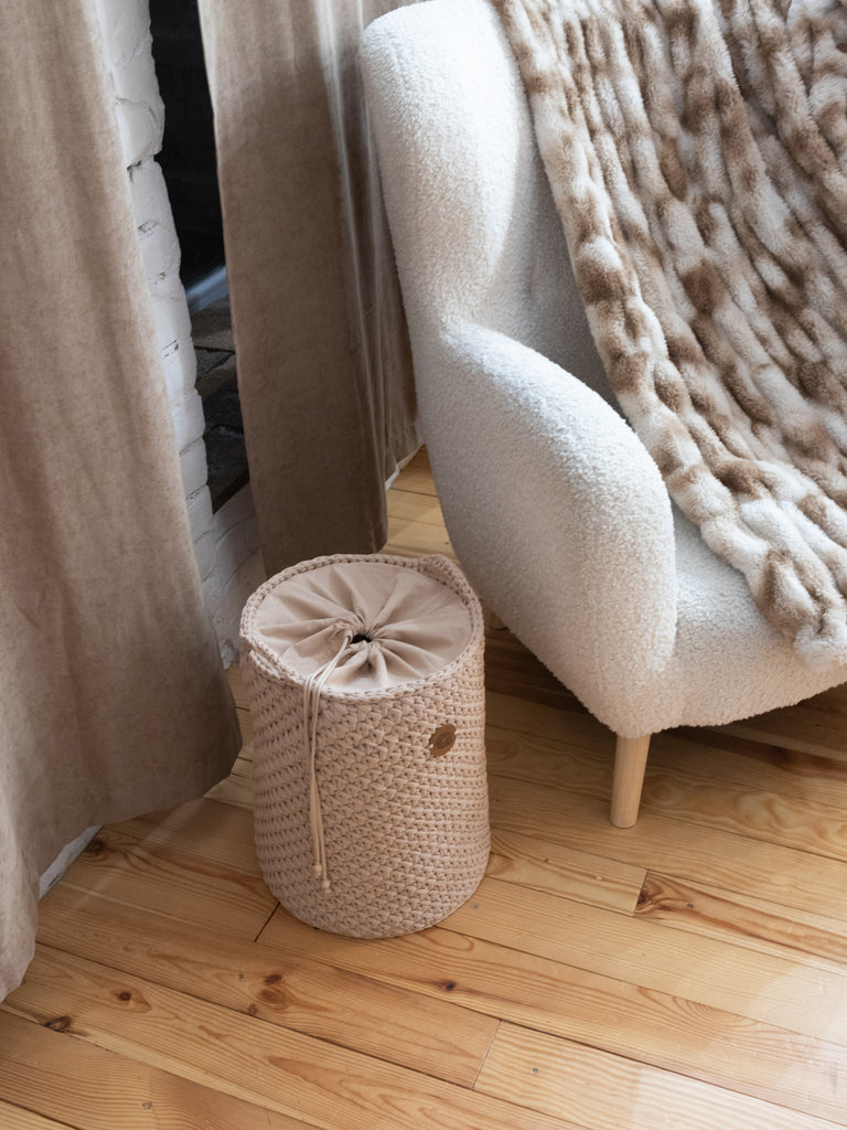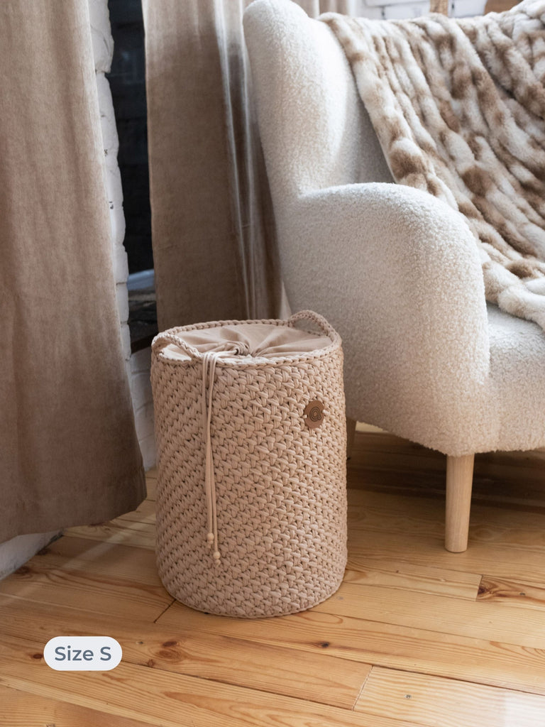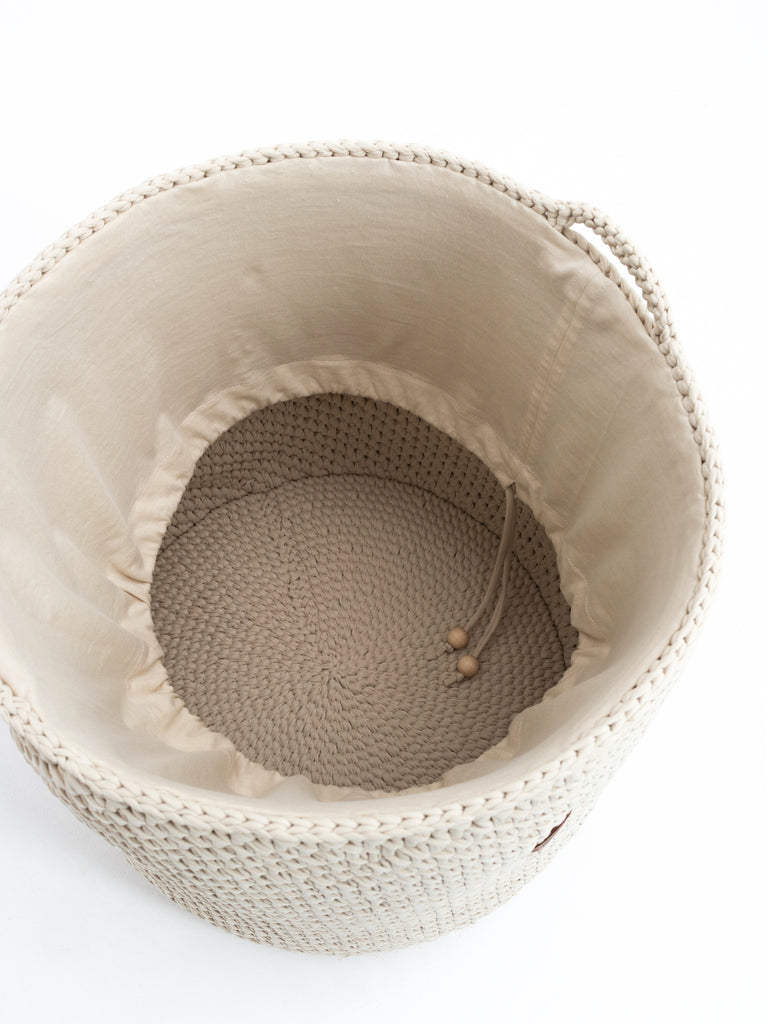 This handcrafted basket is made of 100% cotton yarn. It features a round bottom and sturdy shape perfectly due to the pattern and tight crochet. Equipped with handles for easy movement and convenient tightening from above.