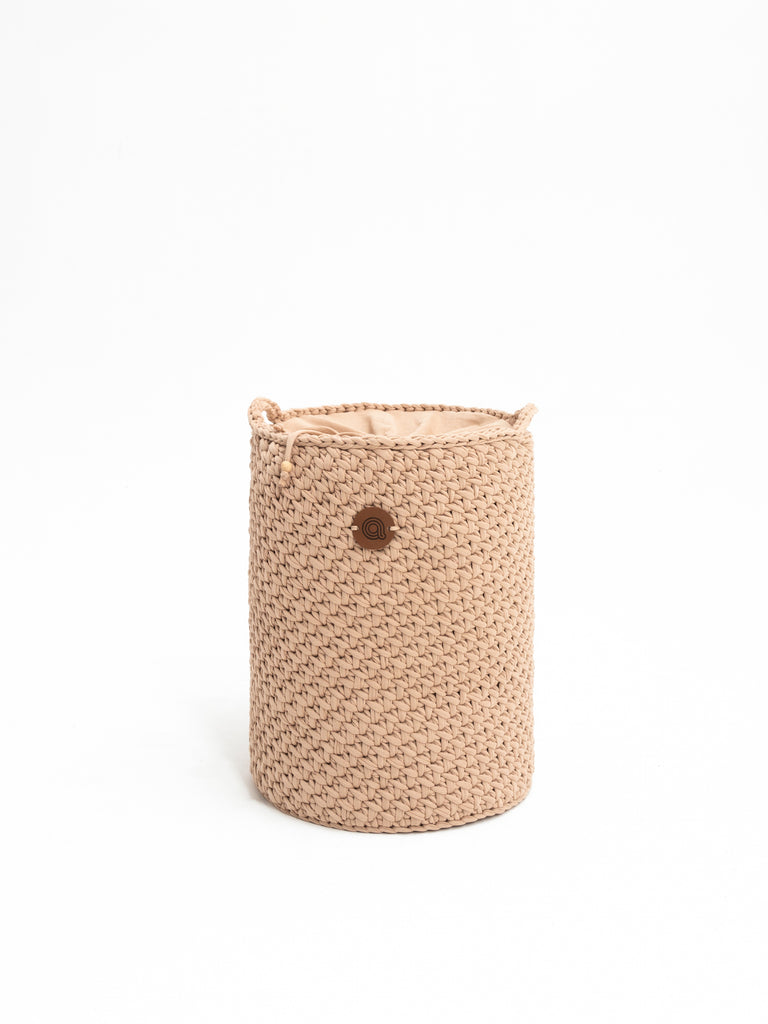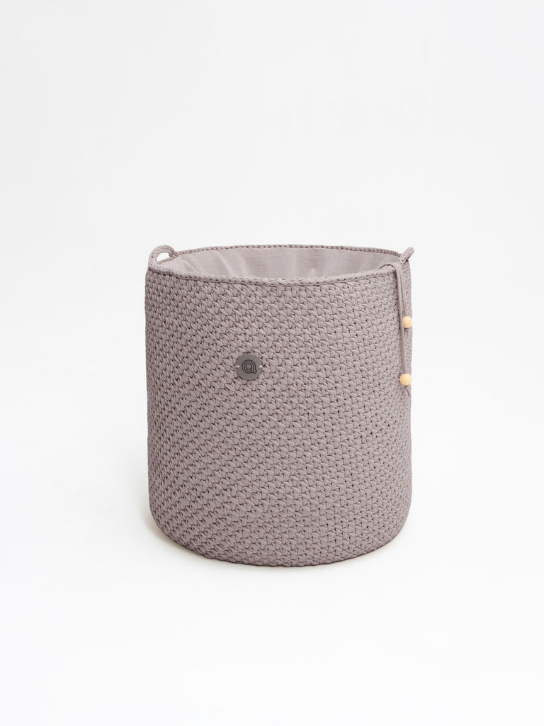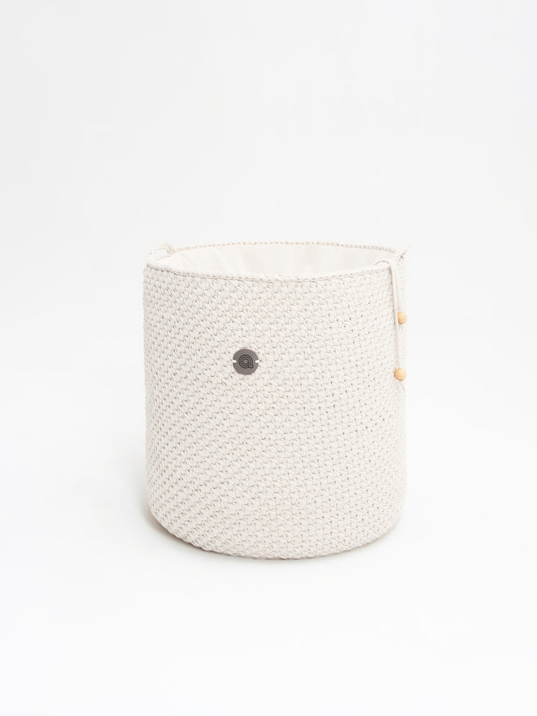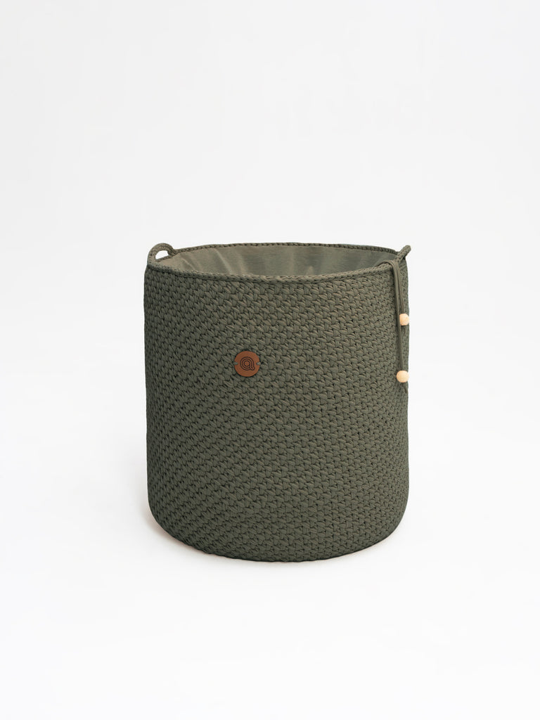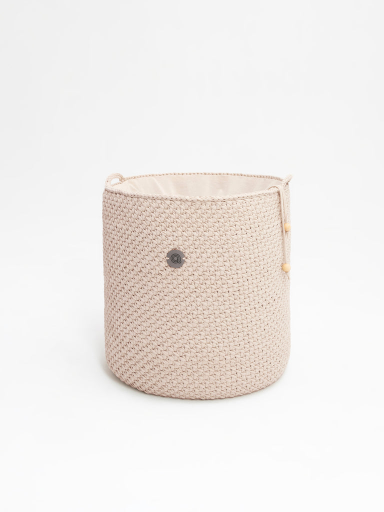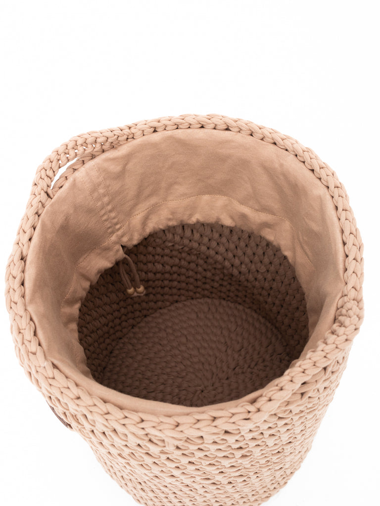 This handcrafted basket is made of 100% cotton yarn. It features a round bottom and sturdy shape perfectly due to the pattern and tight crochet. Equipped with handles for easy movement and convenient tightening from above.