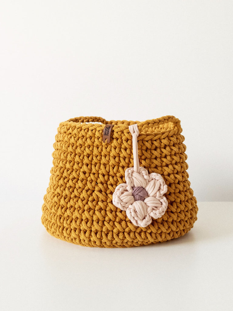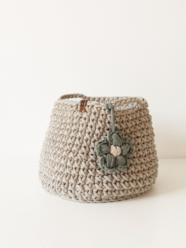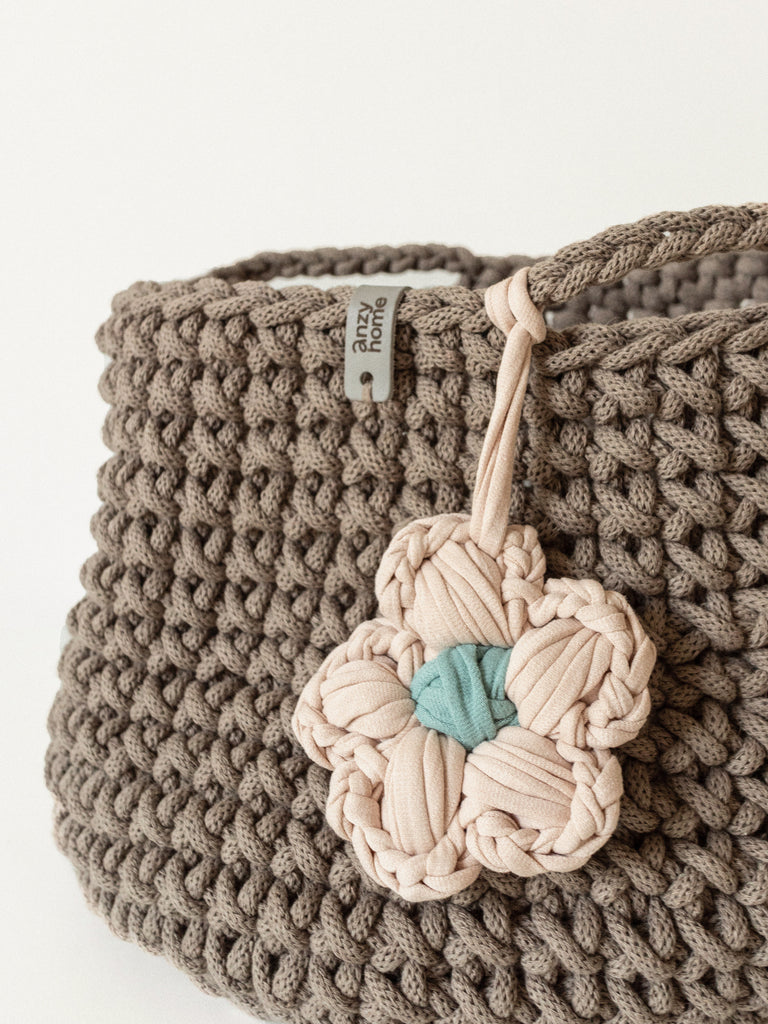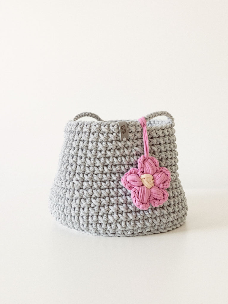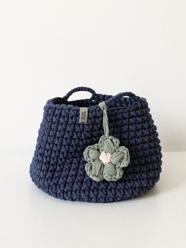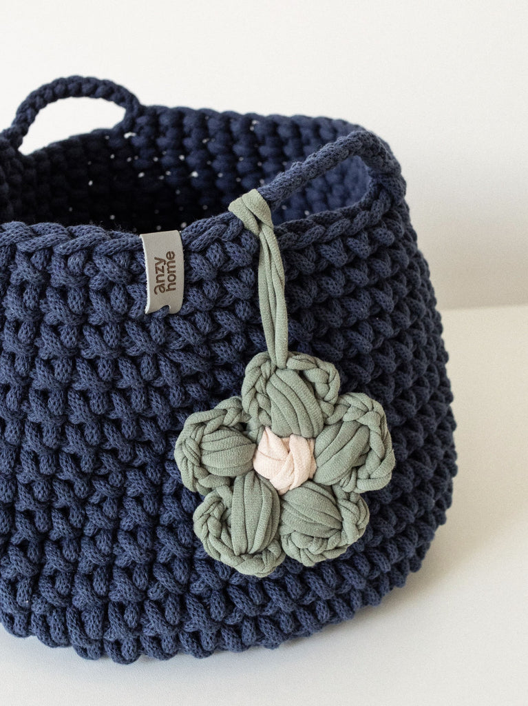 This handcrafted basket is made from recycled cotton in curated colors to suit any nursery or kids' space. The basket is complemented with a flower accent which adds a cozy feel wherever you place it.