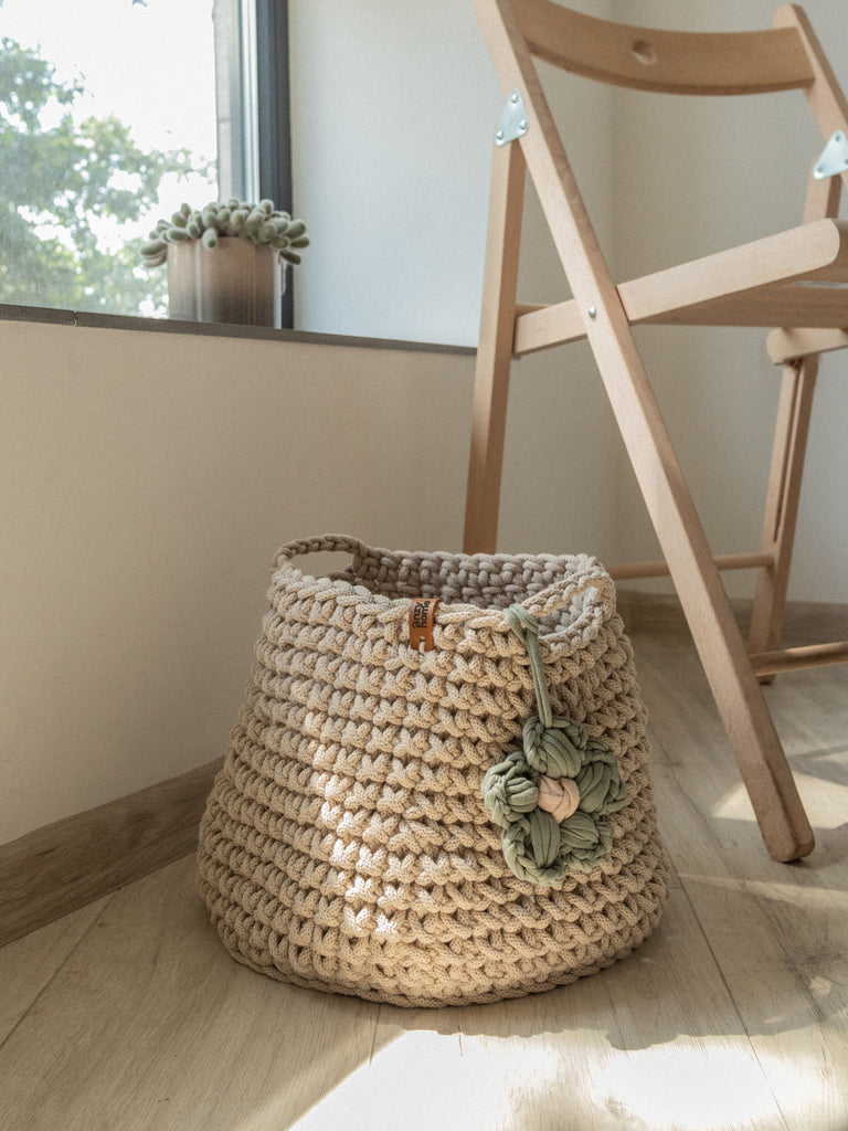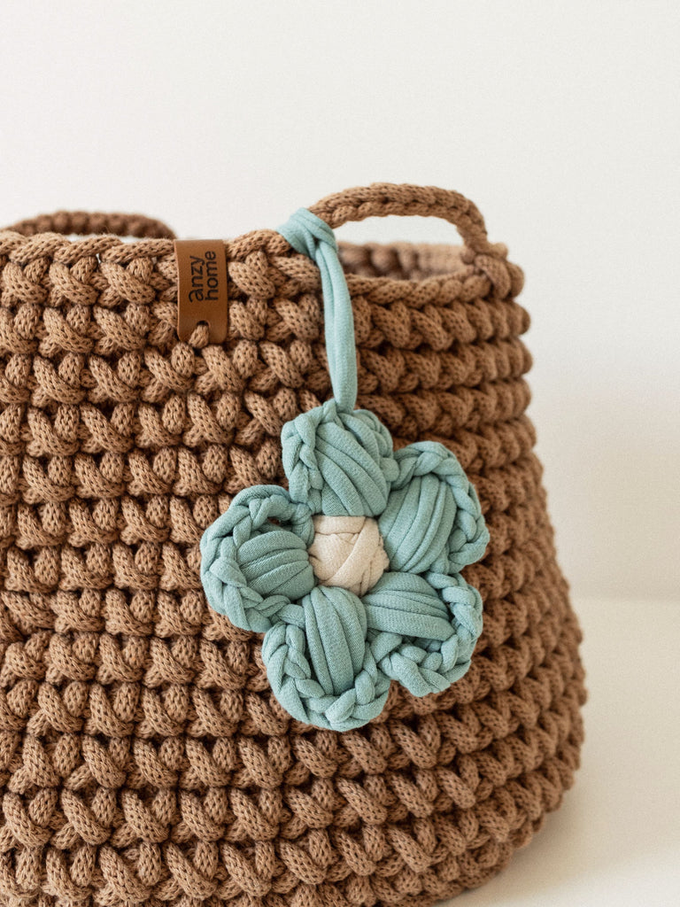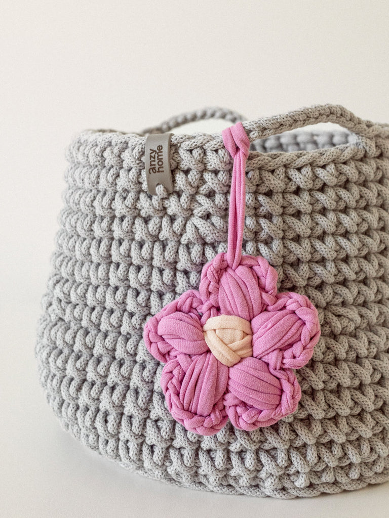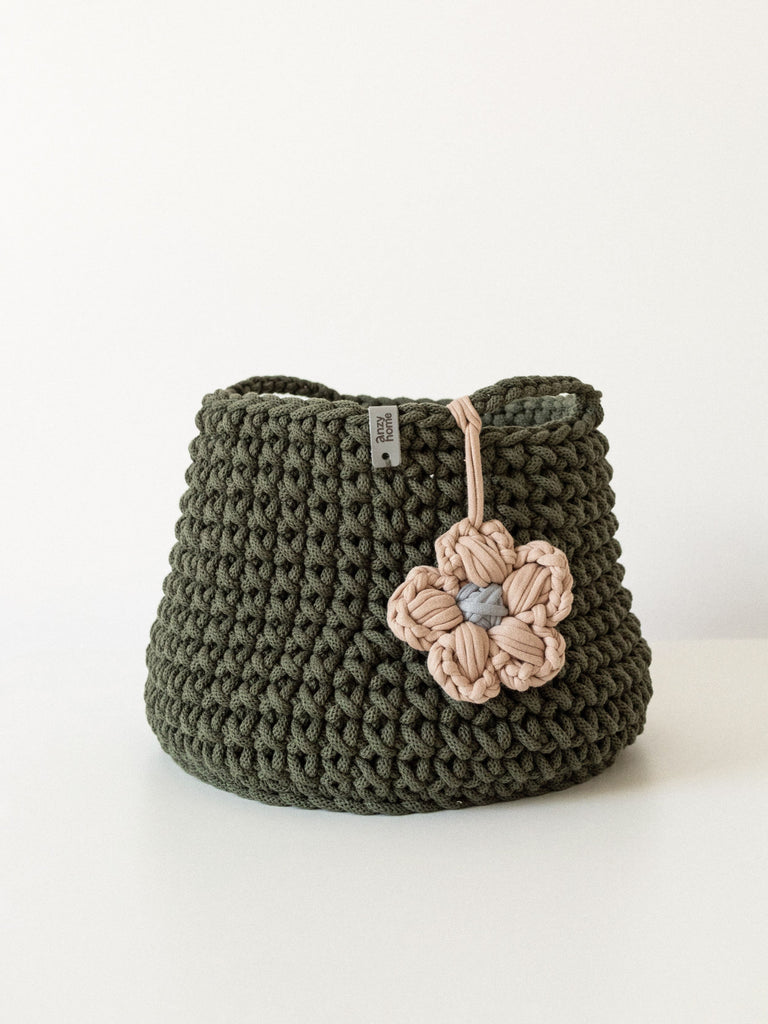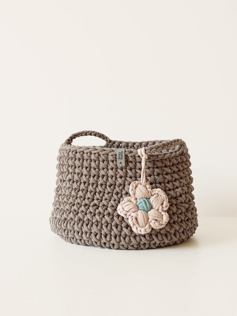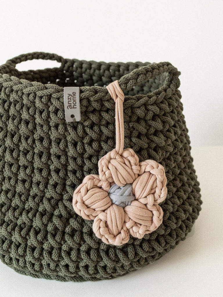 This handcrafted basket is made from recycled cotton in curated colors to suit any nursery or kids' space. The basket is complemented with a flower accent which adds a cozy feel wherever you place it.