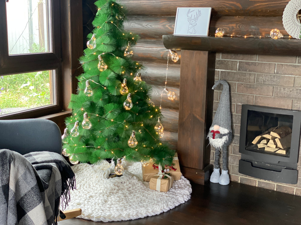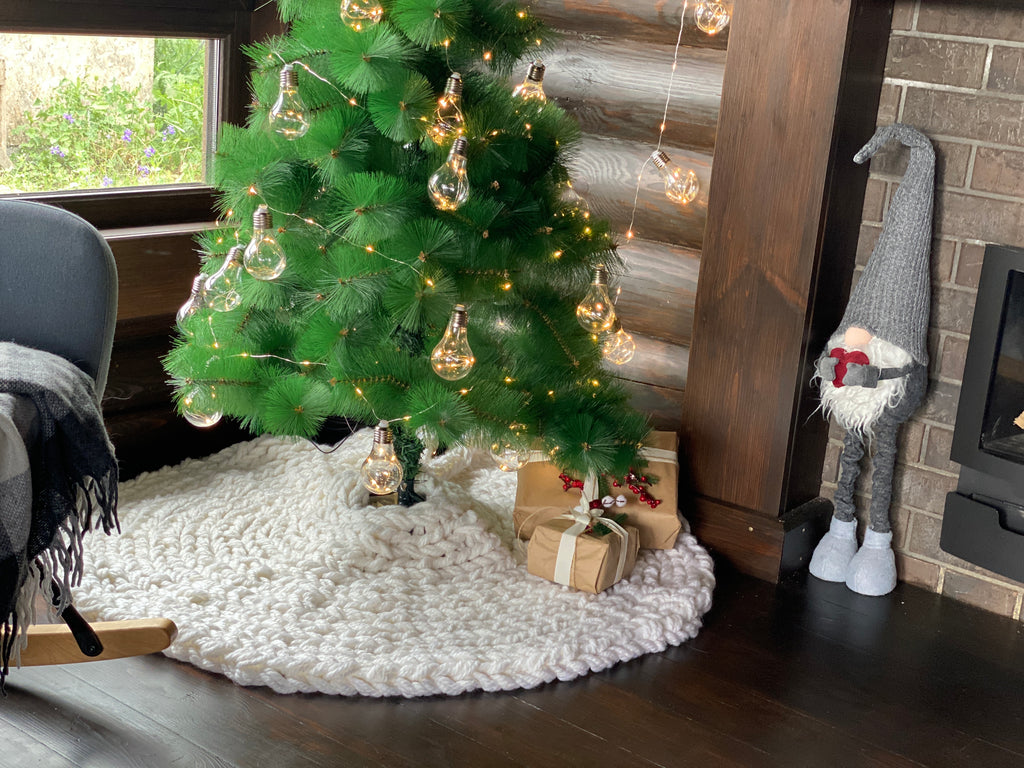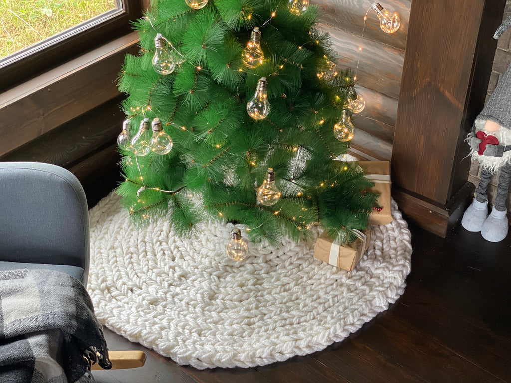 The Christmas tree skirt is arm-knitted of super chunky semi-wool yarn. It is durable but soft and delicate like a cloud.